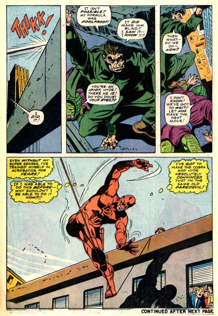 Meanwhile, the Cobra and Mister Hyde embark on a crime spree across the city, apparently rightly convinced that their enemy Thor (who goes unmentioned for the rest of the story) will not stop them. By sheer coincidence, they hit the building across the street from Nelson & Murdock’s law offices–and when Hyde threatens to drop a cornice on the crowds below, Daredevil is spurred into action. Assisted by Foggy, the truly sightless crusader makes his way to the rooftop, where he awkwardly hurls his billy club line across to the next building and attempts to make the crossing. The Cobra and Hyde are stunned by his appearance, and make no move to stop his approach–which is good, because Matt almost slips off his line to his death repeatedly. But somehow, this convinces the two villains that Daredevil is in full fighting form (“No one but Daredevil would have the nerve to clown around that way thirty stories above the ground! We can’t fight him and the police!”) and they skedaddle.