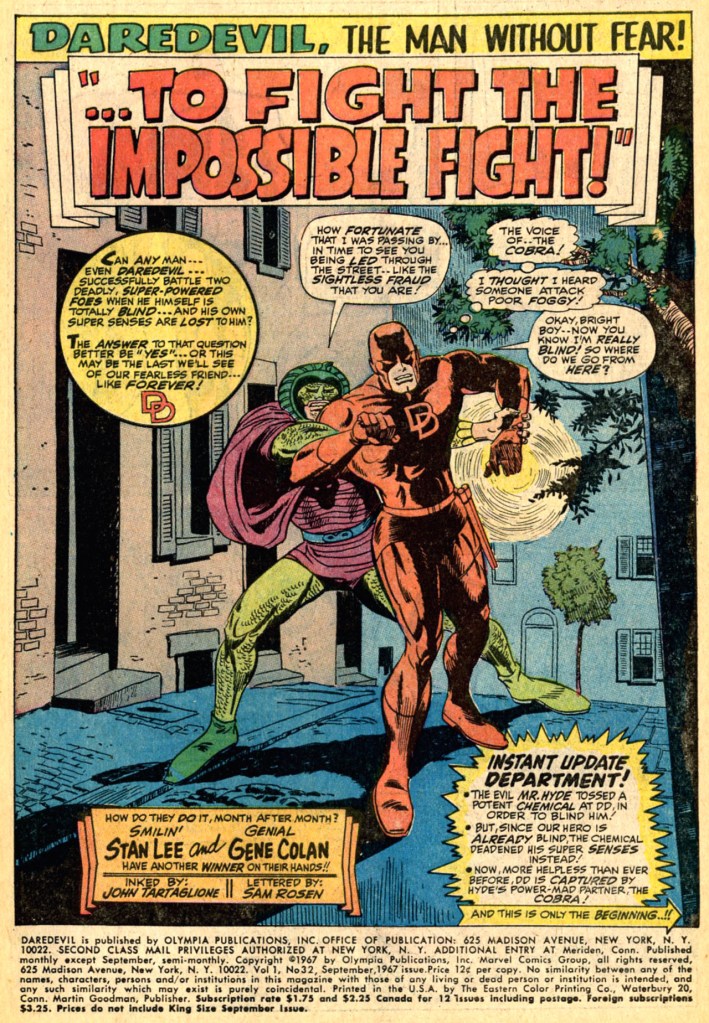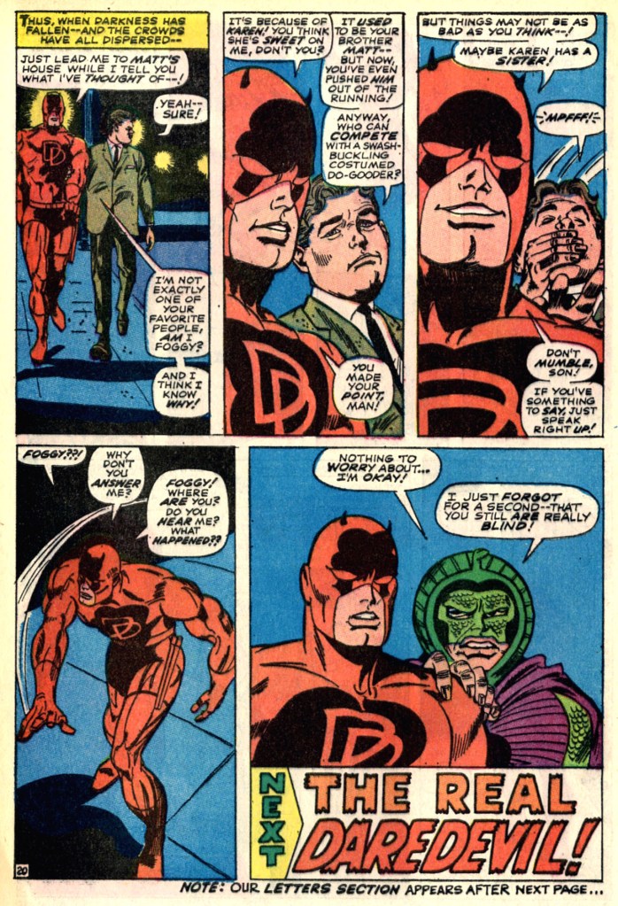 A chagrined Daredevil slowly inches his way back to the law office rooftop and to safety, and is praised for his bravery by both Foggy and Karen, neither of whom acknowledge the stupidity of what he’s just done. That evening, after the crowds have dispersed, Foggy walks Daredevil to the street, taking him back to Matt’s apartment–god only knows what story Mike dreamed up to make that course of action plausible. But suddenly, Foggy momentarily disappears–and when he grips Daredevil’s shoulder again, we see that it’s no longer Foggy but rather the Cobra, who now has the sightless Daredevil at his mercy! To be Continued! Actually, that final panel looks strange to my eye–the Cobra figure in particular looks like there was some other hand in it. So I wonder if Colan didn’t wrap this issue up in a different way and then Lee asked for a change to get some manner of good cliffhanger into the story. The balloons, too, look as though they were re-lettered somewhat in the office.