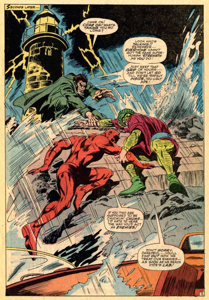 Stan wastes no time in the third part recalibrating the situation at the end of the preceding issue, as Daredevil instantly realizes that it’s the Cobra he’s walking with and that Foggy has been taken out of commission. Matt doesn’t seem especially concerned about his old friend and partner–though, in fairness, he’s got some more immediate problems. For some reason, the Cobra leads Daredevil to a waiting car driven by Mister Hyde, and the trio take off for yet another hide-out. Hyde is upset that he’s been fooled, so he wants some manner of elaborate revenge on his unseeing foe–again, this all reads like Lee trying to make some logical sense out of the events that Colan has drawn. He fails–but you kinda just have to roll with it. Hyde’s revenge is so complex that the villains drive Daredevil all the way to New England, where they transfer him into a speedboat and head for a nearby lighthouse. By my estimation, this trip must have taken them at least four hours–I hope that Daredevil at least managed to get some sleep during the ride.