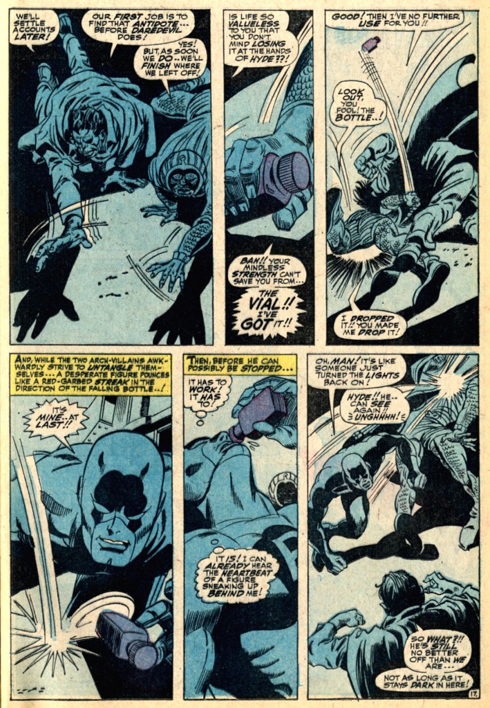 What’s more, that klutz Mister Hyde yells out to te Cobra to keep Daredevil away from the antidote to his condition–which means that, in order to kill Daredevil, these two dopes have just driven him four ours to the one place on Earth where he can get his sight back. Nice job there, guys. A big ol’s extended action sequence breaks out at this point, all lovingly colored in monochromatic blue to get the effect of darkness across, as the three characters vie for the bottle of antidote, playing keep-away with it as they struggle. And forget about the fact that Mister Hyde is strong enough to tear steel and the Cobra is both agile and ductile and has poisonous weapons–with no powers other than his familiarity with moving in darkness, Daredevil beats these two clods senseless.
