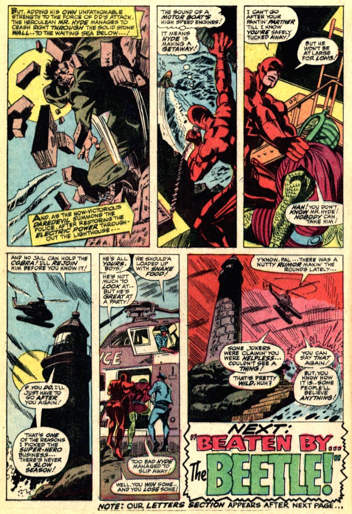 Eventually, of course, Daredevil is able to lay hands on the elusive bottle of antidote–and seconds after he downs it, his radar-senses come back to life. Now once more restored to his fighting trim, the Man Without Fear Or Many Brains finishes mopping up on the two baddies, causing Hyde to go hurling through the wall of the lighthouse and plummet to the ground below. Now, being Mister Hyde, the villain not only survives that fall, he immediately gets up, races to the speedboat and takes off–but Daredevil a this point has decided that he’s had enough of this story. Maybe Thor will eventually show up to take Hyde in. DD’s happy enough to hand over the Cobra to the arriving authorities, who will presumably use their helicopter to give him a ride back to far-off New York. And that’s how this whole masterwork wraps up!