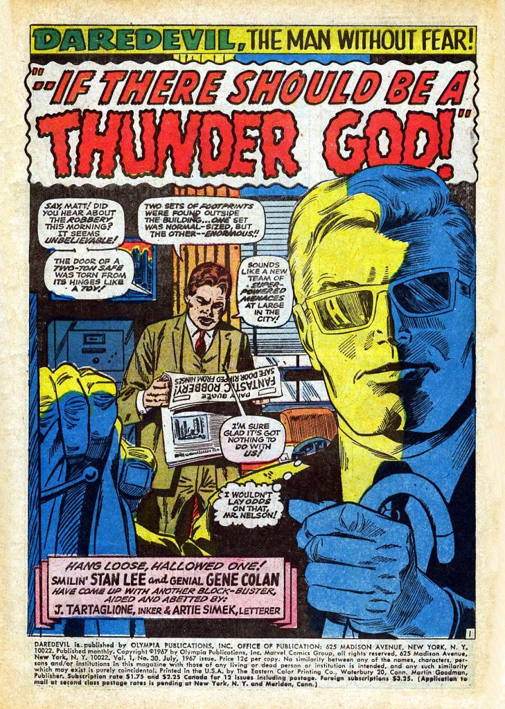 A very belated agreement that this sequence is the epitome of the Lee/Colan DAREDEVIL. You haven’t lived until you see Lee whipping out portentous dialogue for Thor (“Even though I have bested thee– I say thee yea!”) alongside DD’s wacky jokes (“Say it isn’t so, pussycat!”)