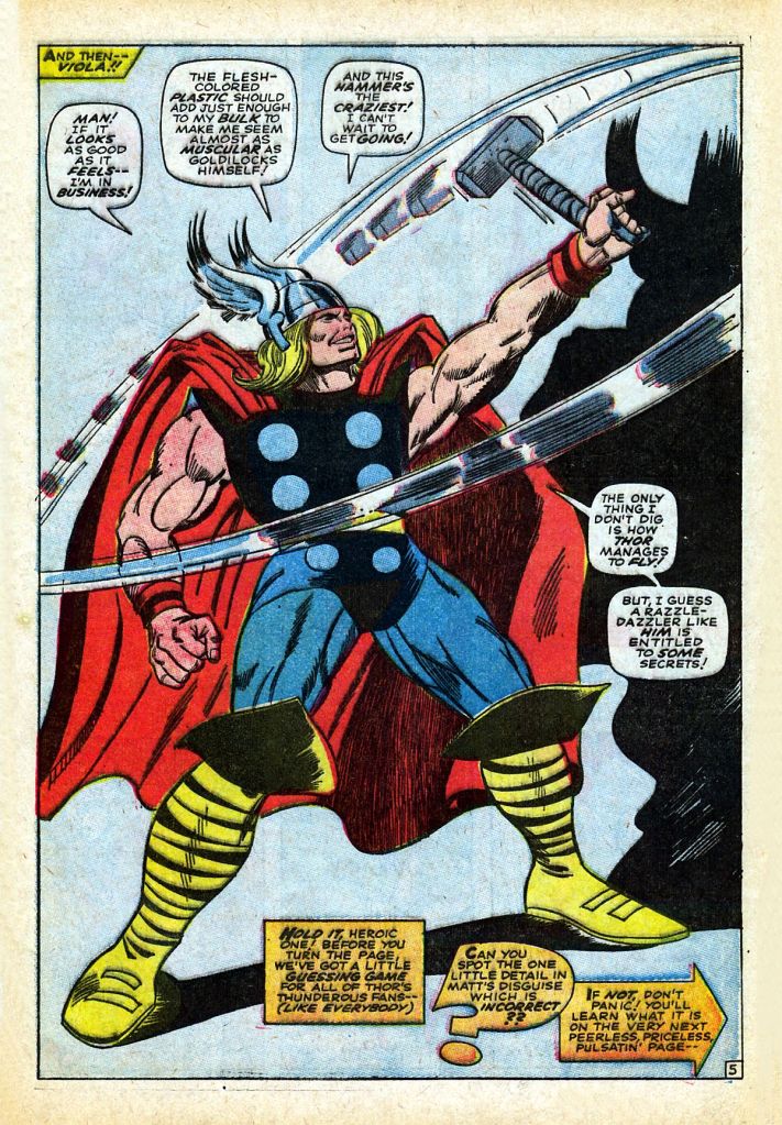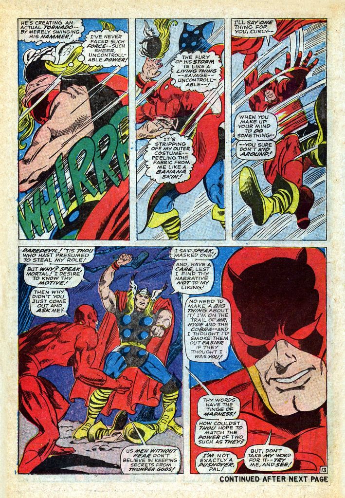 Okay, so we cut to the medical offices of Doctor Donald Blake, were the good Doctor hears news reports of “Thor” swinging around the city. The Thunder God apparently can’t be bothered to go after his old low-rent foes Cobra and Hyde, but an impostor is something else entirely, so he transforms himself into his godly persona and wastes no time locating the disguised Daredevil. And this being Marvel in 1967, when two super heroes first meet, they have to fight. Daredevil attempts to explain his ruse, but he sounds legitimately like a nut, and so Thor kicks him around for a while–until ultimately, the swashbuckler promises not to go parading around in Asgardian garb any longer.