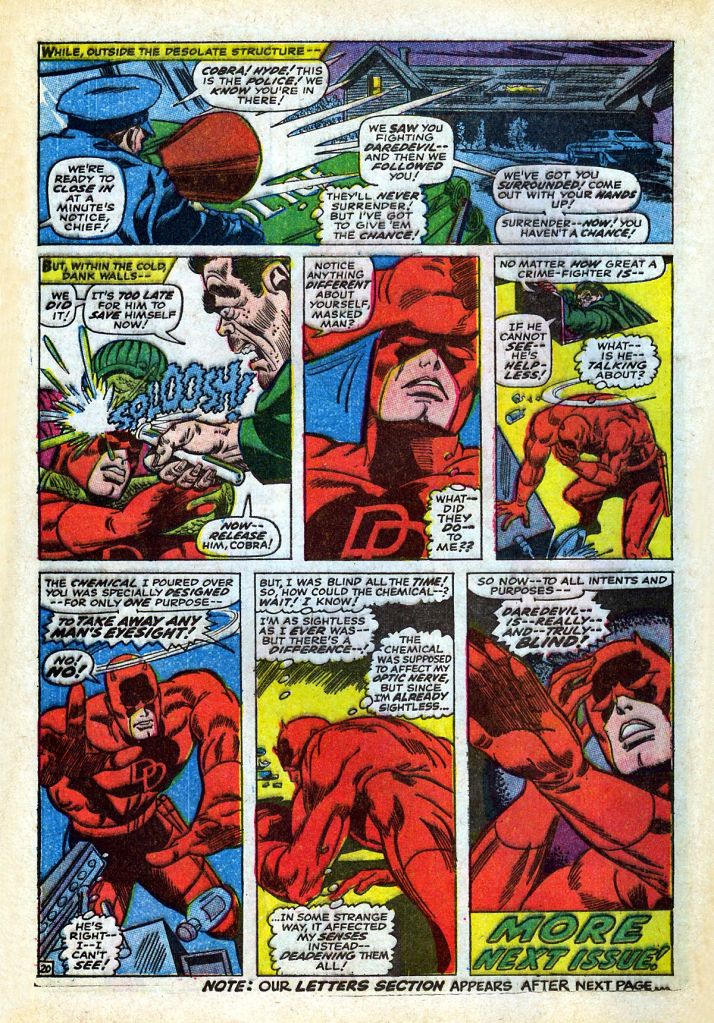 The next issue opens with Daredevil realizing his plight. Fortunately, the police have followed his battle with the Cobra and Mister Hyde to their lair, and the two super-villains take it on the lam. But tis still leaves Daredevil unable to see with the cops closing in. Now, Daredevil isn’t wanted by the police, but he seems to feel it’s important to get out of there before they can find him, but rather than doing something smart like changing into his other identity of a blind attorney, Daredevil instead makes his way out onto the street by feel–where he’s accosted by well-wishing admirers before he can make is way back to Murdock’s apartment by calling himself a cab.