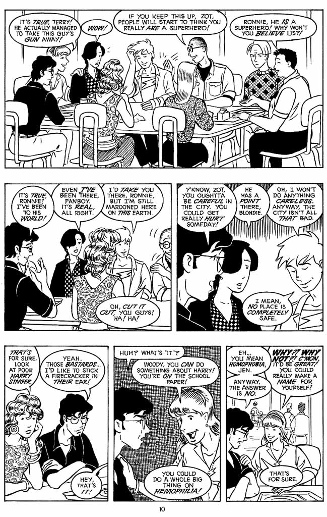 She’s also not sure that these feelings are right. Because of what society has told her, being a lesbian is wrong, it’s an aberration, something to be ashamed of, something to be hidden. Zot gets to be on top of things, figuring out what’s going on and reassuring Terry that he and her friends will stand with her no matter what she does. But ultimately, that decision to reveal herself is a choice that she’s going to have to make for herself.