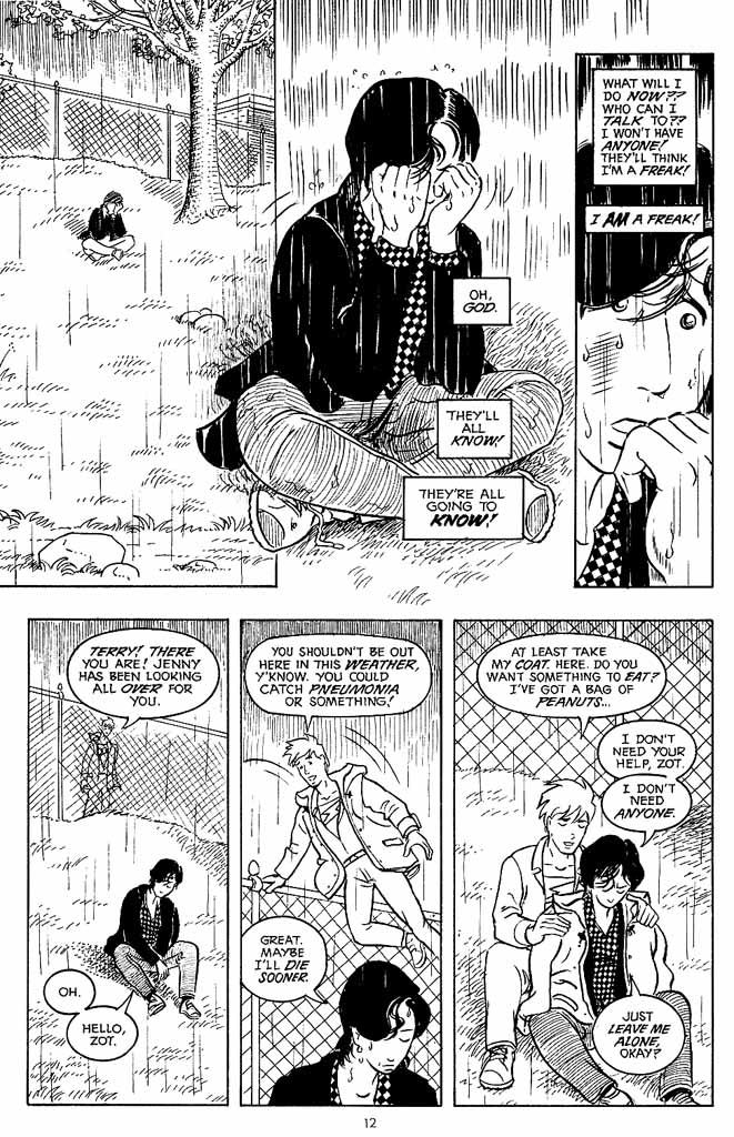 First, a bit of scene-setting. ZOT! is the story of young Jenny Weaver, the product of a broken home, who is ushered into a world of adventure when she meets Zot–alias Zachary Paleozogt–who comes from a parallel universe modeled after the sort of expansive visions of future life that were the rage around the turn of the century. In his own world, Zot is a super hero, using gadgets devised by his inventor uncle to keep his city and the people safe. In adventuring with Zot, Jenny finds an escape from her depressing regular life and the broken home in which she now lives. But as I mentioned earlier, by this point in ZOT!’s run, McCloud was getting a bit restless, and so he shifted the storyline away from fantastical elements into more of an exploration of character. He was interested in doing smaller, more intimate stories.