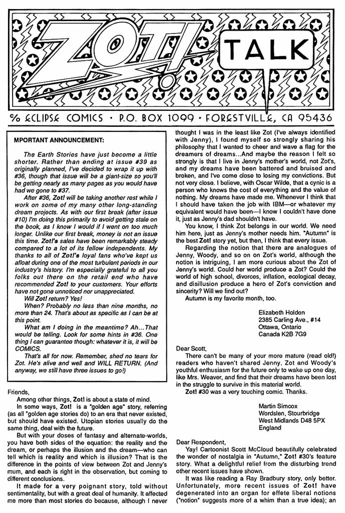 Because McCloud knows that the appearance of the letters page on the right side signals the end of the story he can create that false ending–and then include an additional page after the page turn that provides the true uplifting finale. Reading this book for the first time is like an emotional roller coaster ride–but all in the hands of an expert operator in McCloud. This story as well as the rest of the black and white run of ZOT! was collected a few years ago in a big softcover volume, and I honestly don’t recall how they handled this moment in it. I’m certain that they attempted to duplicate the experience, but without the structure of a regular comic book where the letters page was a recognizable and accepted part of the package that always fell at a certain point, I’m not sure how successful that might have been. Either way, the entire series of ZOT! is well worth the time to seek out, either in collected form or the harder-to-find single issues. But this one in particular pitches a Perfect Game