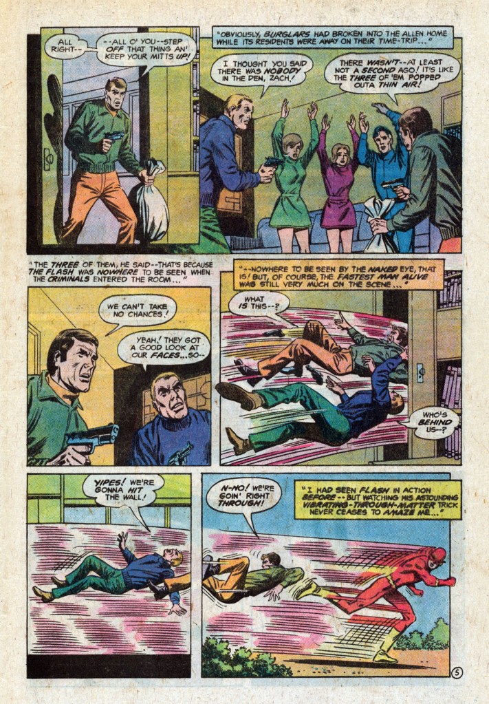The story opens as indicated on the cover, with Iris’s true father Eric Russell happening upon a historical mystery. According to records, his ancestor died on the morning of January 13, 1978–which would mean that Eric and his entire ancestral line wouldn’t exist. What’s more, the same ancestor was photographed in battle with the Flash in the afternoon, in the guise of the Viper. And in the evening, he got married. Confused by these events, Eric prevails upon the visiting Flash and Iris to take them back to the 20th Century for a visit, intending to investigate. There’s a great, silly scene when, as the quartet arrives in the present, they come across a pair of burglars ripping off the Allen home. Bad choice! Flash dispatches them in seconds.