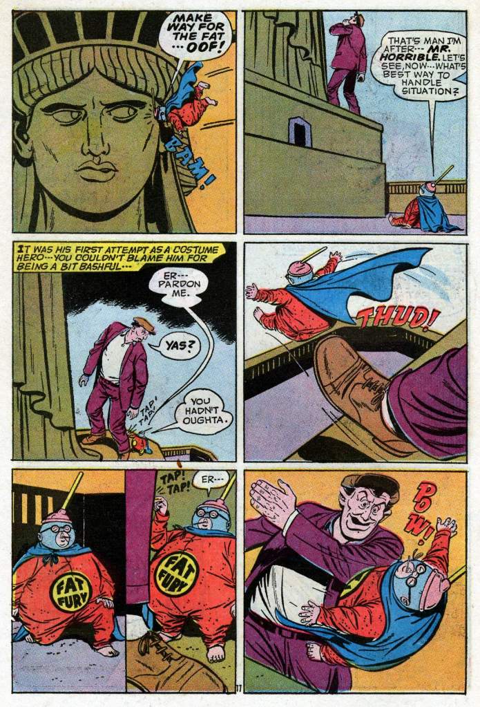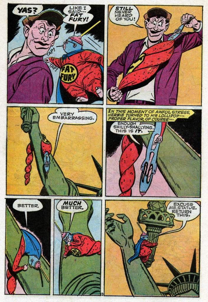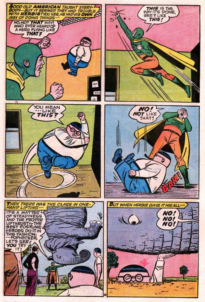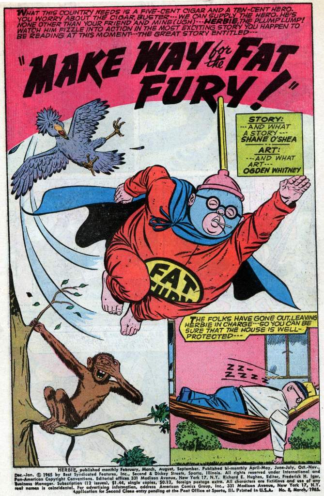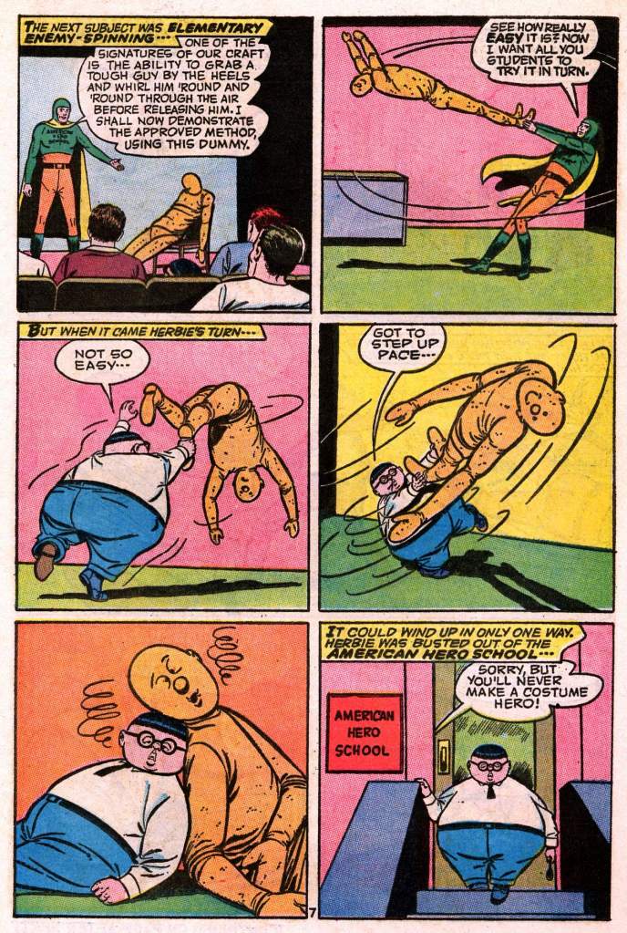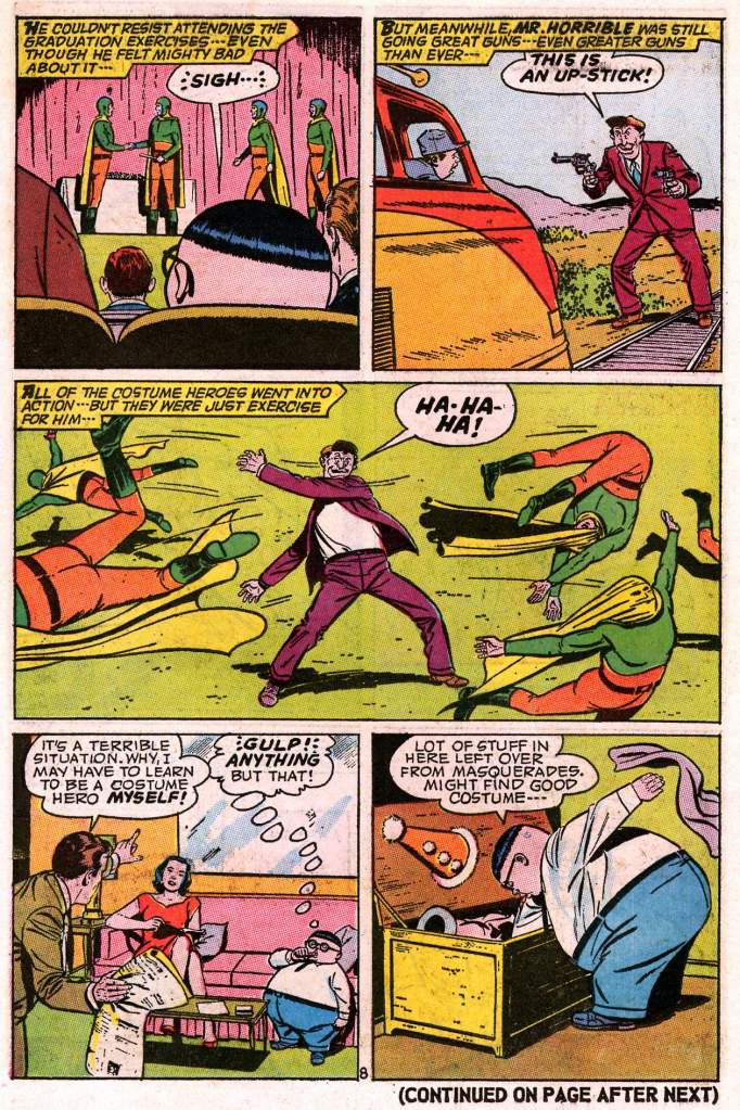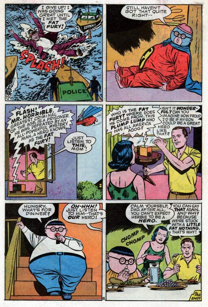 It’s been a while since we looked in on ol’ Herbie–so here’s another classic story, the origin of his costumed identity as the Fat Fury. This story was produced in the midst of the super hero craze set off by the Batman television show in 1966, which suddenly made costumed crusaders a topic of conversation in the zeitgeist again.