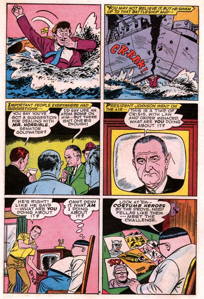 Whitney sneaks his old character Skyman into that final panel on this page. It’s also interesting to see both LBJ and Barry Goldwater depicted full-on in a super hero comic book–most other companies during this era avoided depicting politicians most of the time.