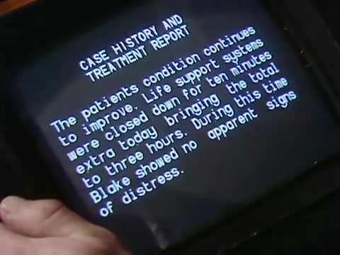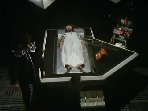 Avon has been placed in a computerized device, and moments later he finds himself waking up elsewhere in the complex. He makes his way through the compound until he finds the chamber in which Blake is being treated. And there is Gareth Thomas, sporting the beard he had grown to do Shakespeare. “Well, you certainly took your time finding me.“he says. Avon wants to know about the discovery Blake promised in his messages that would make them rich and invincible, but Blake tells him that he is too injured to survive transport–he needs the life support machinery he is hooked up to in order to stay alive. A beep signals the time for Blake’s next treatment, and so Avon withdraws so as to not be caught by the base personnel. But he is caught, and gets clubbed into unconsciousness in the hallway by one of the guards. As he passes out, we see that Avon is still under the machine from earlier, and a voice offscreen tells her subordinates to get Avon out of there. “We must keep the continuity right.“