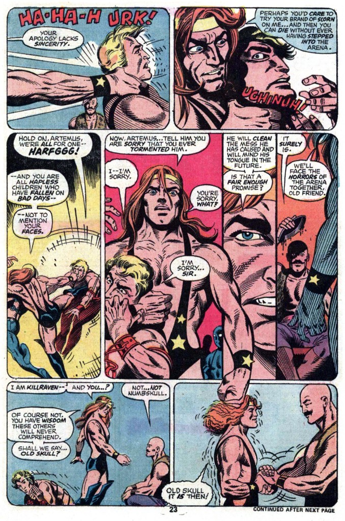 So what was this issue about? The bulk of it is an extended series of flashbacks illuminating the life story and history of Killraven’s developmentally challenged buddy Old Skull–who grew up on a ranch, where his hard-as-nails father called him “Numbskull” because of his bald pate, and the name stuck. After the martians invaded and he was swept up into the fighting pits, Killraven befriended Old Skull and gave him his proper name in recognition of the wisdom he clearly possessed despite his odd speech patterns and manner of expressing himself. There’s also a lot of content relating to what we might today call toxic masculinity and true manly vitrues–McGregor rarely wrote his characters on the nose, so there was always plenty of subtext in whatever they were saying and doing.