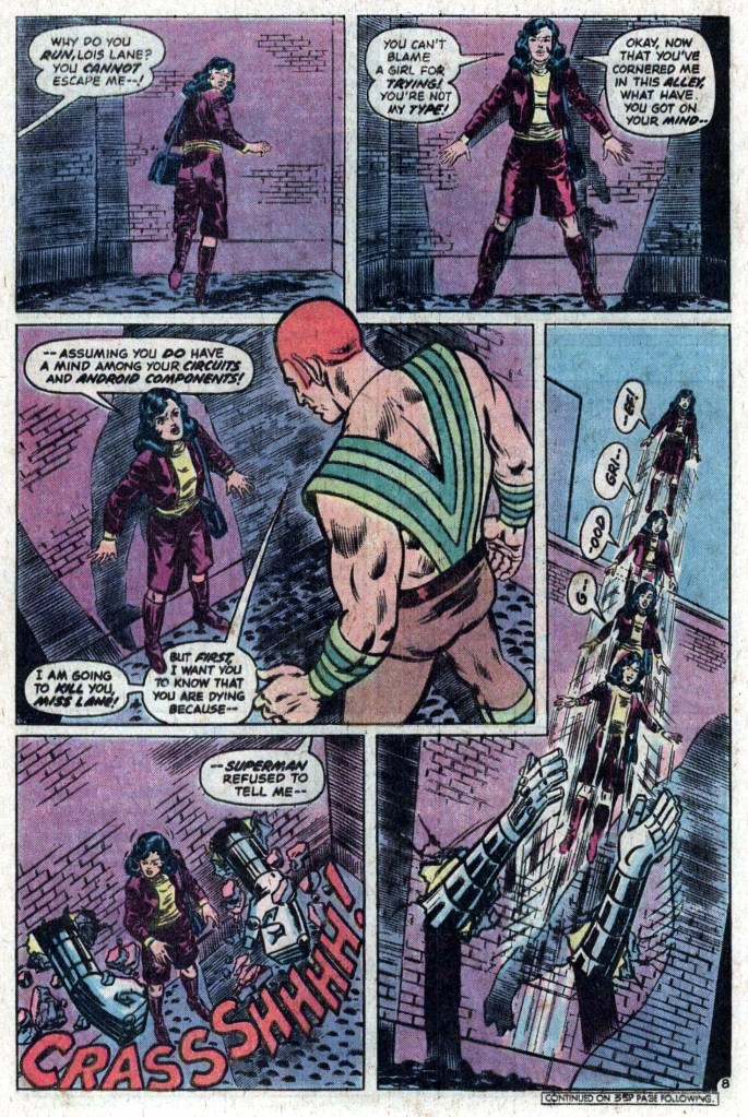 So we open with an extended recap of events, and a short action sequence showing the Supermobile in action against some criminals attempting to pillage the U.S. Armory in Metropolis. There’s also a bit of fun with Steve Lombard and Lana Lang, and an appearance by weatherman Oscar Asherman (who had been named after long-time DC archivist, Allan Asherman.) But then it was time to get down to brass tacks, as we cut to Lois Lane being cornered in an alleyway by an enraged Amazo. But before the android could lower the book, the Supermobile’s big metal hands burst through the wall behind Lois, grabbing her and throwing her into the sky, where it could pick her up and carry her to safety.