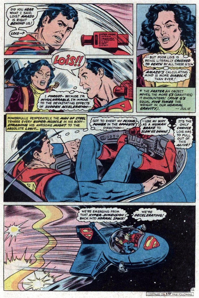 But Amazo is not so easily dissuaded, and so a protracted super-battle takes place between the multi-powered android and the super-powered vehicle. At one point, Amazo winds up hurling the ship into space so hard that it passes into a hyper-dimensional rift. Within the cockpit of the Supermobile, Superman is invulnerable–but Lois is not, and the extreme acceleration is crushing her with the G-force. Superman hastily works to bring the Supermobile to a halt on a nearby asteroid that somehow has Earth-normal gravity and a breathable atmosphere. He carries Lois out of the cockpit, attempting to make sure that she’s all right. It’s a pretty stupid move given that Amazo is right behind them, but chalk it up to Superman being concerned about Lois’s well-being.