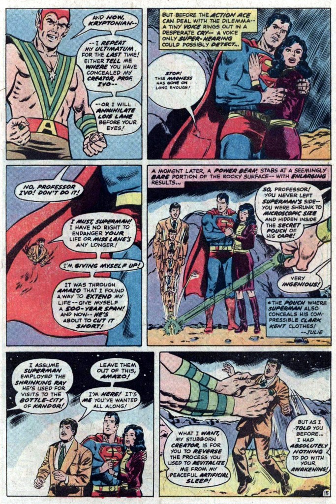 Lois wakes up before too long, not really any worse for wear. But then, suddenly, Amazo is there–and he reminds the Man of Steel that even on this far-off asteroid, the red sun radiation that is passing through this area of the galaxy will see him robbed of his powers. Amazon reiterates his ultimatum to Superman: hand over Professor Ivo or else Amazo will annihilate Lois. And then, there’s a tiny voice from the pouch in Superman’s cape where he typically stashes his Clark Kent clothes while in action. Turns out that Superman had miniaturized Professor Ivo and has been carrying him around in his cape this whole time. It’s a wonder the Professor didn’t get sat upon! Anyway, the self-sacrificing Ivo can’t let Superman or Lois die in his place, so he offers himself up to his creation Amazo.