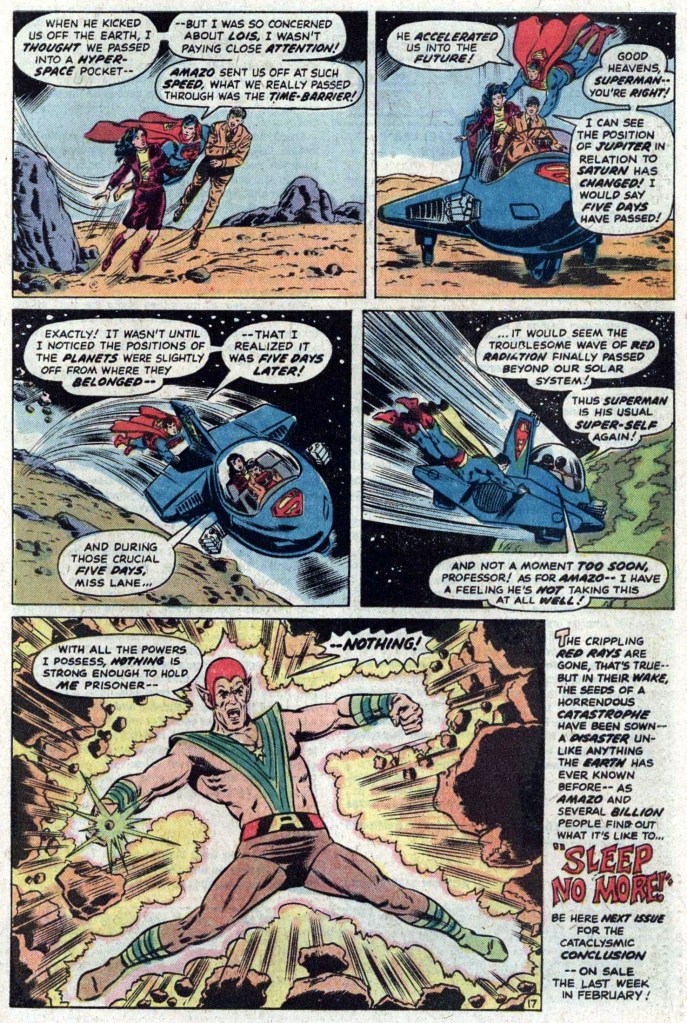 As Amazo moves to kill his creator, Superman suddenly leaps into the air, pile-driving the android into the asteroid. As he, Lois and Ivo evacuate in the Supermobile, Superman explains that he realized that the Hyper-Warp they passed through wasn’t merely a space warp but actually the time barrier. They’ve skipped five days into the future–at which point the red sun radiation has finished its pass through this area. So Superman is his super-powered self once again, and no longer needs the Supermobile to use his mighty abilities. But as the trip rockets away back towards Earth, behind them Amazo bursts free from the asteroid that momentarily held him, vowing that their fight isn’t over. And that’s where this story is To Be Continued!