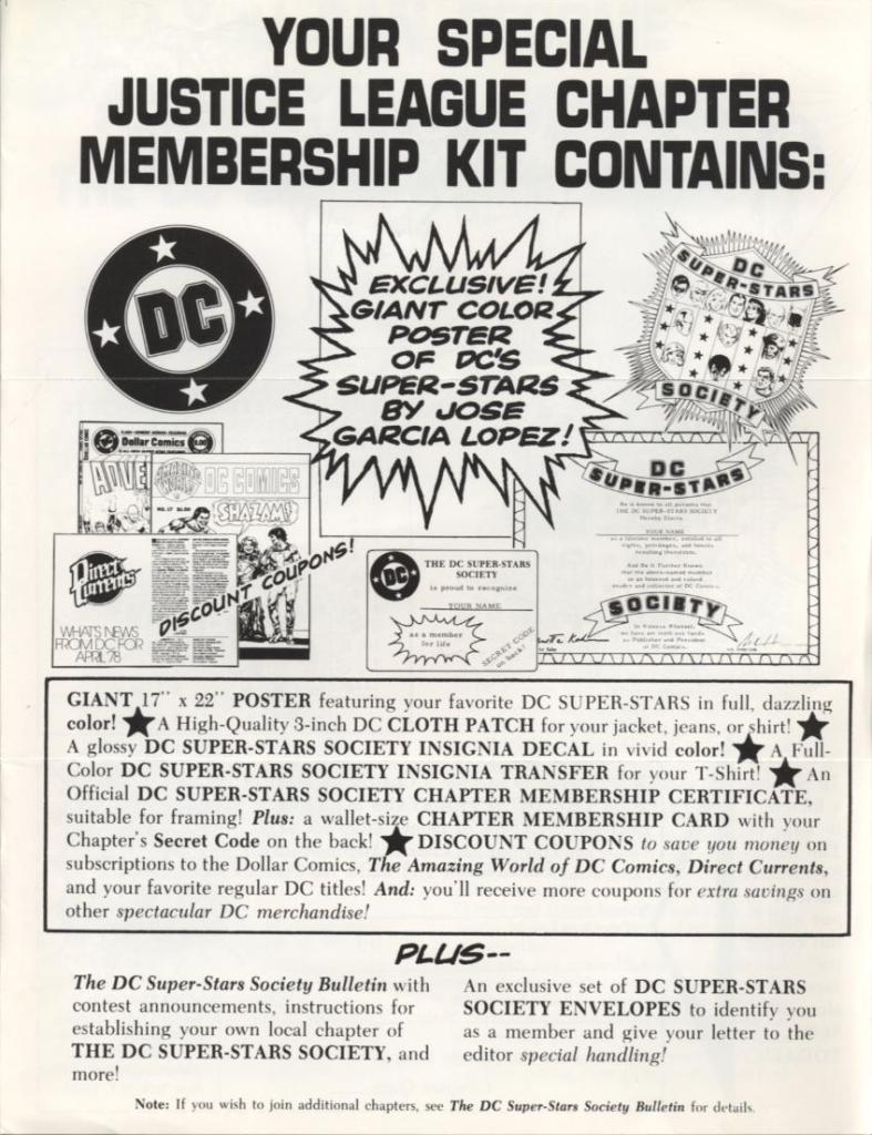 This issue also included an advertisement for DC’s new clubs, the DC Super-Stars Society. I was interested enough to send away for information on three of the chapters: The Flash, Green Lantern and the Justice League. Unfortunately, when the information arrived, it turned out that it would cost $4.00 to join each chapter. That was way too rich for my blood (that dollar amount represented a lot of comics I could buy instead) and so I never bothered to join up officially. The clubs ran for a couple years, mainly offering discounts and merchandise, an early form of direct marketing as DC tried to capitalize on the dedicated audience that it had in the rapidly-eroding mainstream newsstand marketplace.