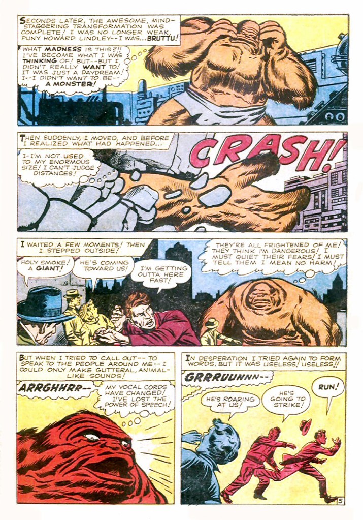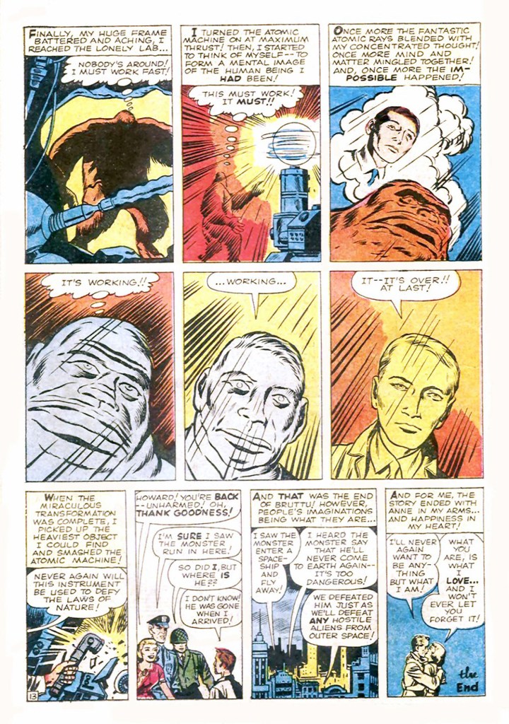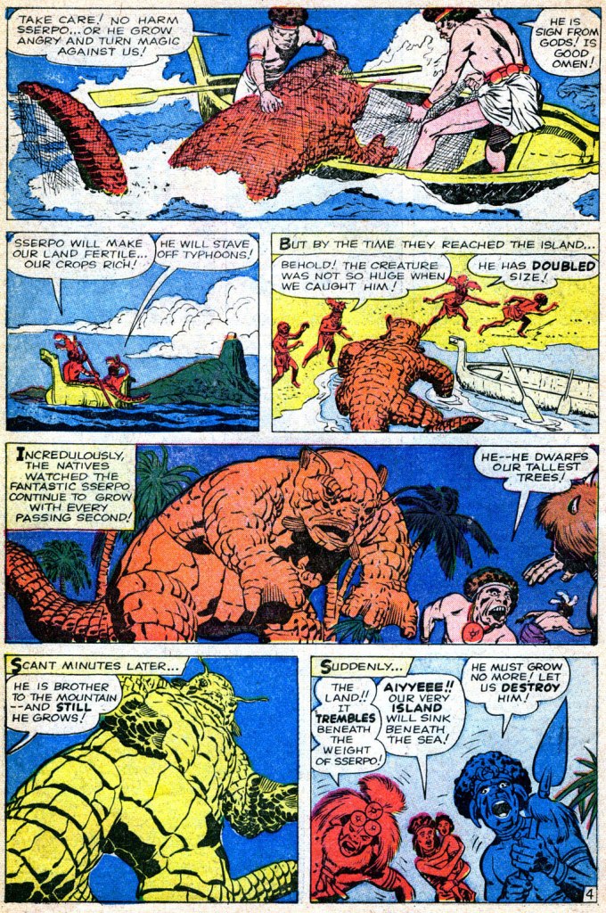 3) Goodman, seeing that super hero books (in particular JUSTICE LEAGUE OF AMERICA) are suddenly selling really well decides to make the whole thing its own magazine. Lee and Kirby retool the pieces that they’ve got in order to make the whole thing into a self-standing package, condensing and compressing as need be.