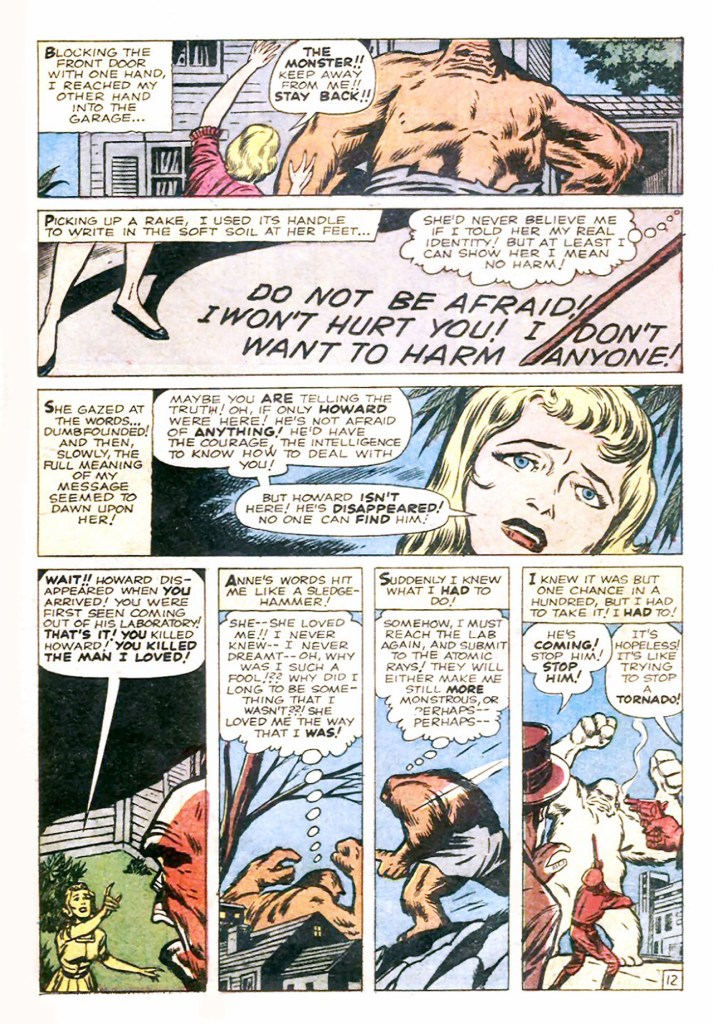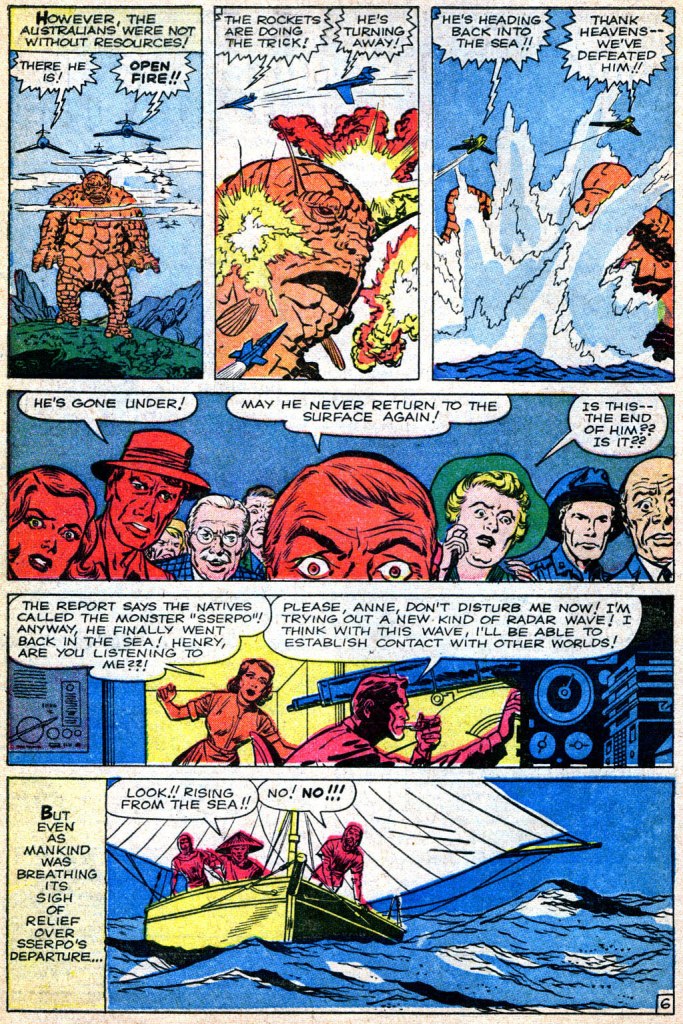I started thinking about the origin specifically because I was reading it and counting elipses, dashes, exclamation marks, and characters beginning sentences with “I — I.” In other words, looking for evidence that maybe Jack dialogued the origin part, then brought it into Stan that way. Sure, there’s a lot of that, but it’s not like FF 6, so I am agnostic about whether Jack dialogued it. I really don’t know what Jack’s writing style was like in 1961, so I can only shrug about that.