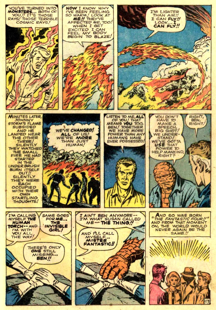 So I’ve been looking at pp. 9-13, a lot. And my general theory is that this was done separately from the rest of the book – I think Stan and Jack did it first, as an origin/proof of concept, with the pin-ups used used in issues 2, 3 and 4. I think Stan then wrote the larger story around it, because he recognized that it needed more of an introduction than Jack brought him.