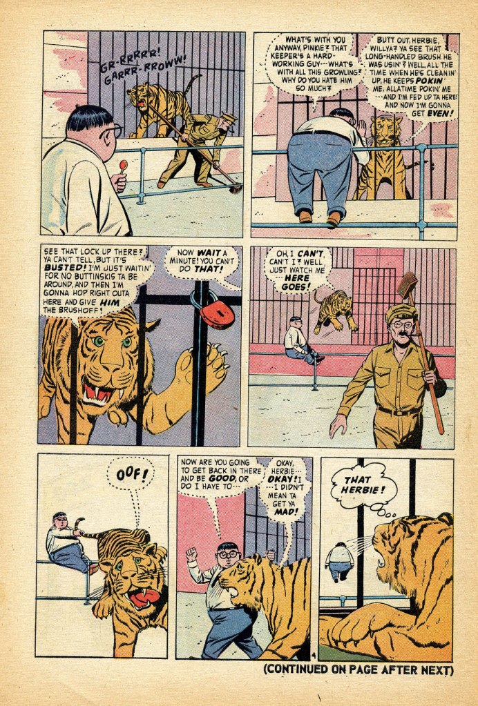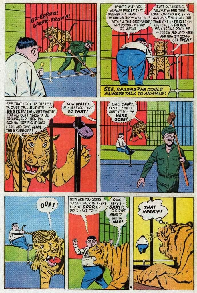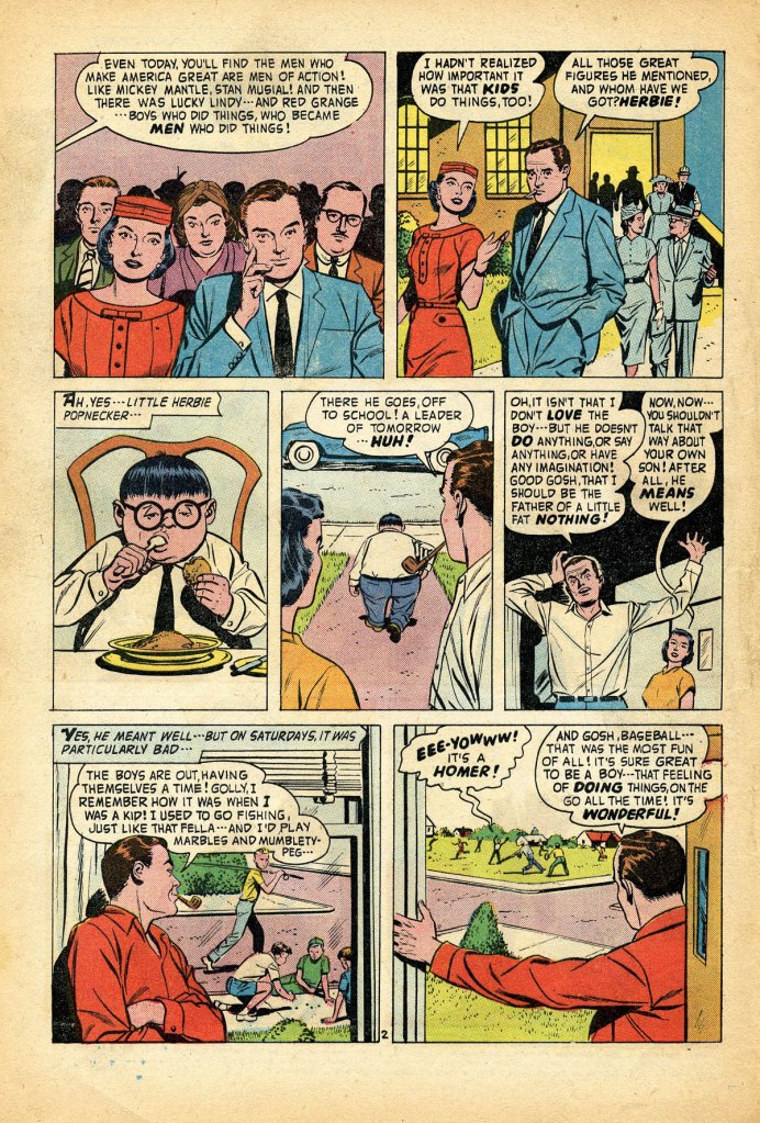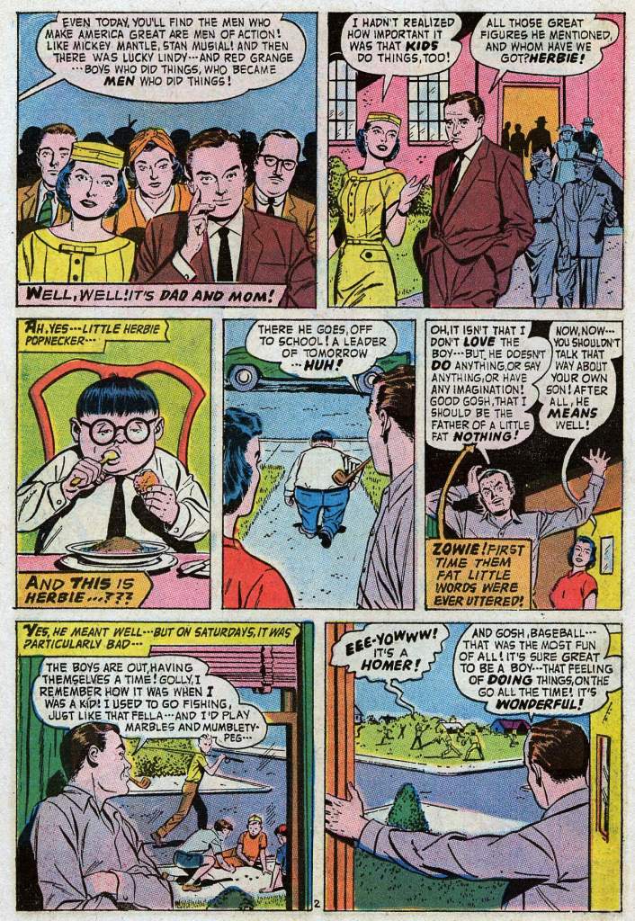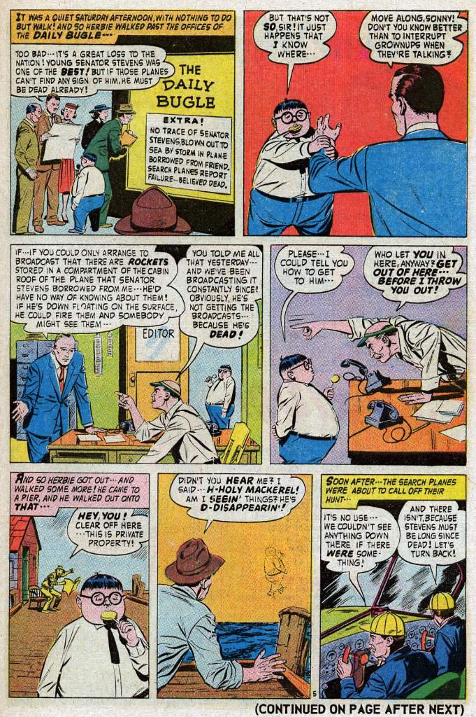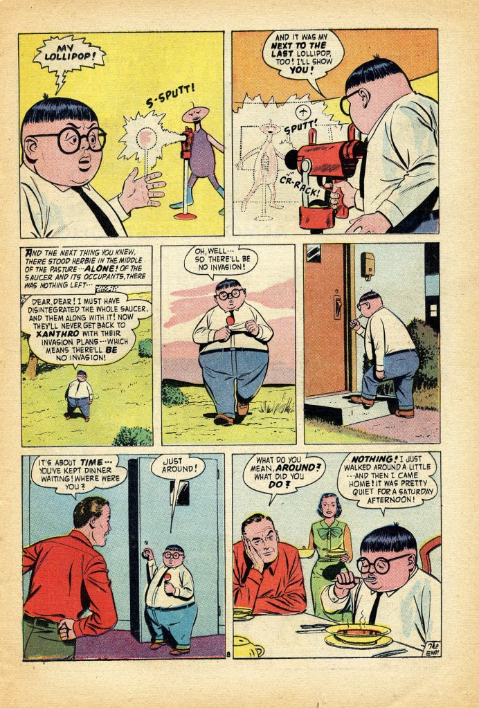 Consequently, the conflicts in Herbie stories didn’t usually tend to center around physical confrontations–there wasn’t anything that Herbie couldn’t lick. But rather, there’d usually be some other point in play, some more abstract goal which Herbie was trying to achieve.