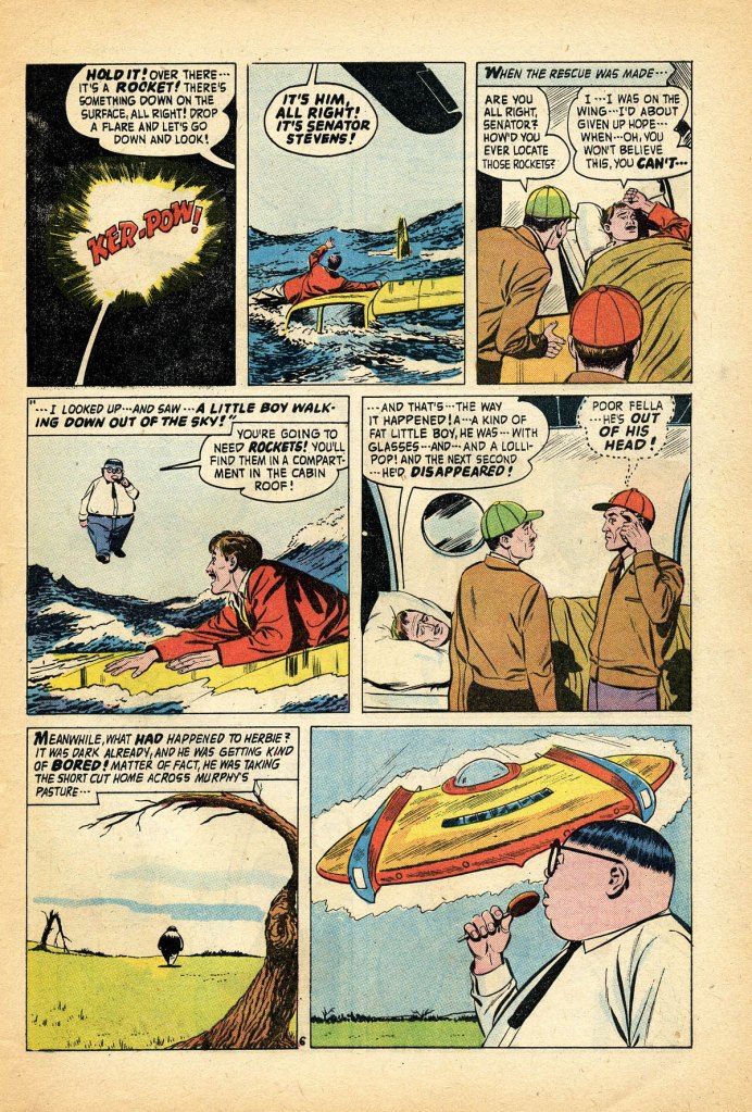 Herbie Popnecker was introduced in a short one-off story that originally saw print in FORBIDDEN WORLDS #73. It was intended as a throwaway tale, one more short strange adventure to fill the pages of the anthology series. But the story and the character proved popular with readers, and creator Richard Hughes subsequently brought him back for a sequel story, then another, and eventually a series. HERBIE was one of the oddest and most unique titles published during the 1960s–hallucinatory, bizarre, off-kilter, dreamlike and possessing a very strange sense of humor. It is wonderful comics.