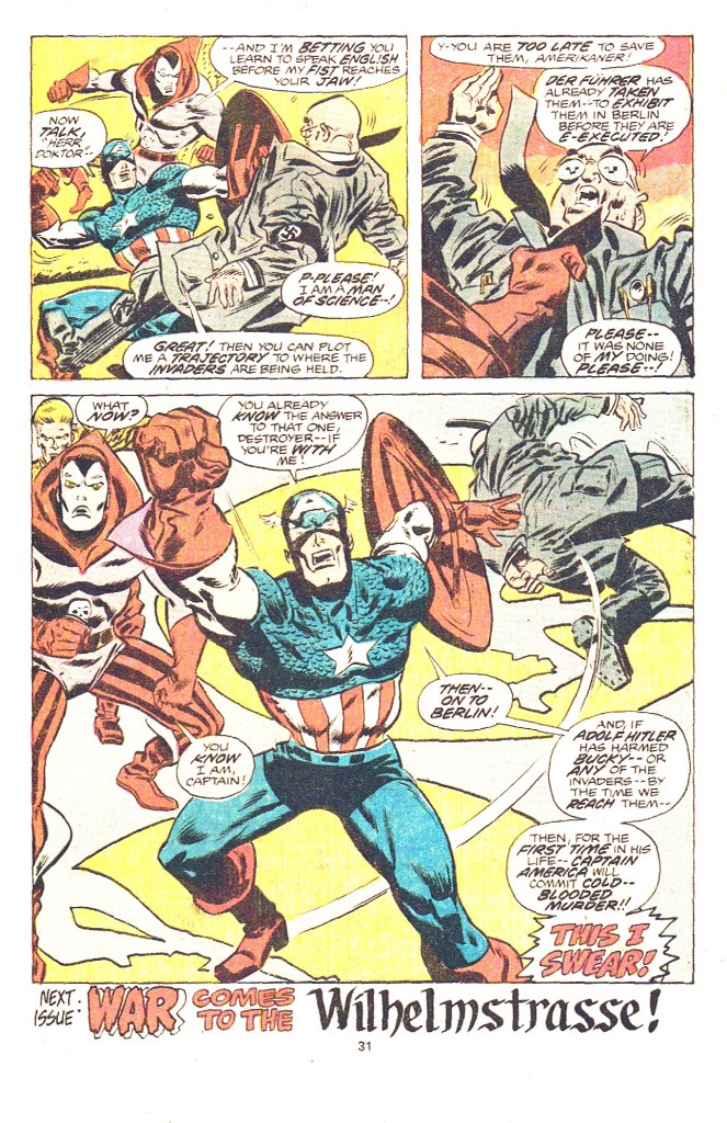 The Destroyer routinely operates behind enemy lines, and so he’s able to help squirrel Cap away in hidden alcoves within the castle, where the two men can catch their breath and talk. It’s here that Roy begins making his changes to the Destroyer’s backstory–rather than being an American war correspondent named Keen Marlowe, the Destroyer is in actuality English–and he removes his awesome face mask to see if Cap will recognize him. His identity isn’t revealed in this issue quite yet, but (spoilers!) he’s really Brian Falsworth, the son of Union Jack, the costumed hero of World War I who had been a featured player in the series.
