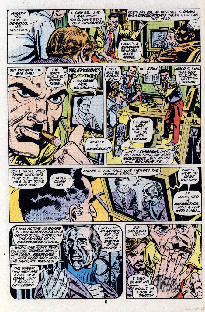 Roy had a proclivity in his work for homaging or referencing other things of which he was a fan, and so this entire story is a riff on King Kong–which makes for very strange source material for a Spider-Man adventure. But you see, J. Jonah Jameson is worried that the Daily Bugle is about to go out of business (how comforted he’d be to know that it’s still going almost 50 years later) thanks to the threat of television broadcast news. As a way of pulling in more paying customers, Jameson has caught wind of a huge monster that a scientist is talking about on the Dick Cavett show and decides that they’ll run a series of articles reporting from the Savage Land where the creature is purported to be. Jonah apparently graduated from the Perry White school of Journalism.
