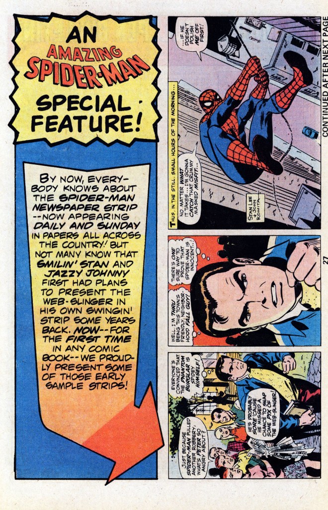 What fills out the remaining pages of this issue is the thing that interested me enough to want to pick the book up. Back in the 1960s, a decade before the then-current Spider-Man newspaper strip, Stan Lee and John Romita had worked up two or three weeks’ worth of samples in an attempt to convince a newspaper syndicate to run the web-slinger as a seven-day syndicated strip. Publisher-in-training was supposed to use these samples to pitch the project to prospective buyers. But a few years later, when Chip was let go and his office was cleaned out, they discovered the original envelope containing the sample strips buried there among other assorted paperwork, unopened and unsubmitted. A missed opportunity for sure.