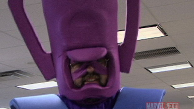 By now, some of you may have visited your local Best Buy, and purchased the special Silver Surfer statuette-and-digital-comics-DVD that’s available exclusively through them. If so, you’ll have seen a video we shot especially for them, depicting life behind-the-scenes here at Marvel, in which I am dressed as Galactus.
