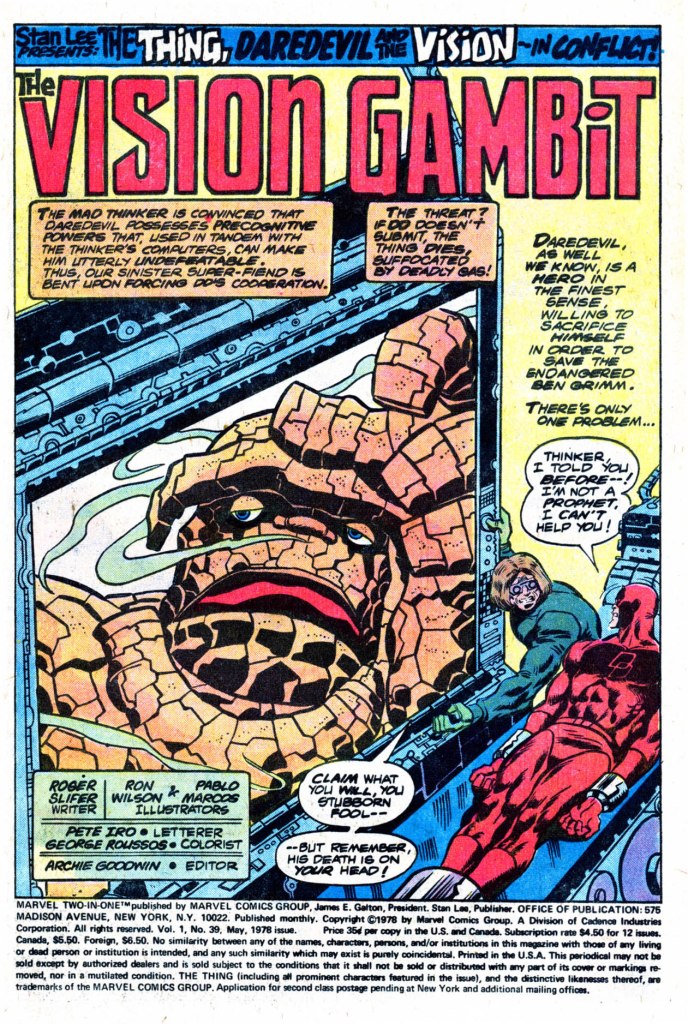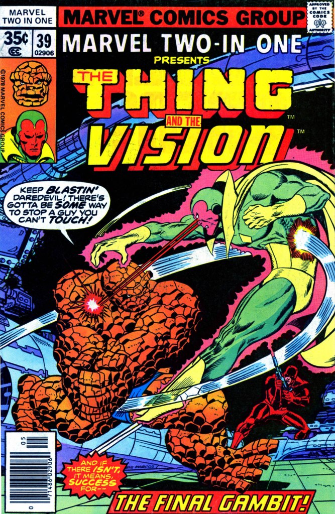 After spending the preceding two issues with only Daredevil as the Thing’s heroic partner in this story, Slifer must have realized that he needed to bring in another headliner. His choice is the Vision–although he also gives almost as much play to his fellow Avenger Yellowjacket. We open where we left off last time, with the Mad Thinker convinced that Daredevil has precognitive powers and attempting to coerce Hornhead into helping him by threatening to asphyxiate the captive Thing. Problem being, Daredevil doesn’t actually have the ability to predict the future–his bluffing using his heightened senses has backfired on him, and now he can’t seem to convince the Mad Thinker that he is incapable of providing him what he wants. I’m not sure why DD doesn’t simply continue his bluff and give the Thinker bad intel–if nothing else, that would buy him and the Thing some time. But whatever.
