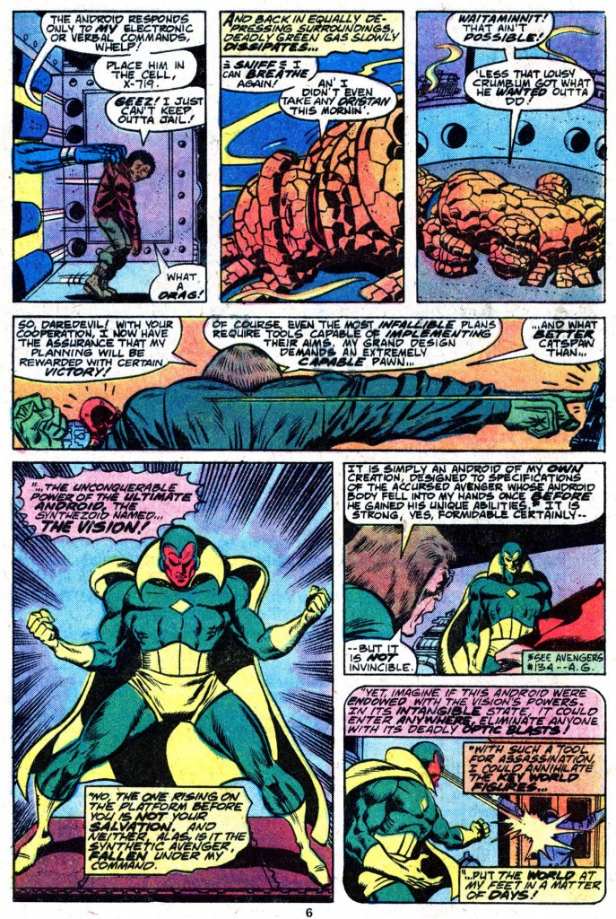 Daredevil does try to run a simpler scam on the Thinker, though, He tells the criminal that his powers foresee them all perishing of a gas leak from the chamber where the Thing is being gassed. To prove his predictive abilities, Daredevil tells him that he’s about to have a visitor–this is because his super-senses have detected the street kid from last issue sneaking around in the complex. The Thinker dispatches a robot to scoop up the kid and lock him away, and now convinced of Daredevil’s predictive powers, he turns off the gas and outlines the next part of his confusing and needlessly-complex plan. He’s built a bunch of replicas of the android Vision, but without all of his powers. So he wants Daredevil and the Thing to go out and capture the Vision for him, so that he can study the android Avenger and duplicate his powers in his own knock-offs.