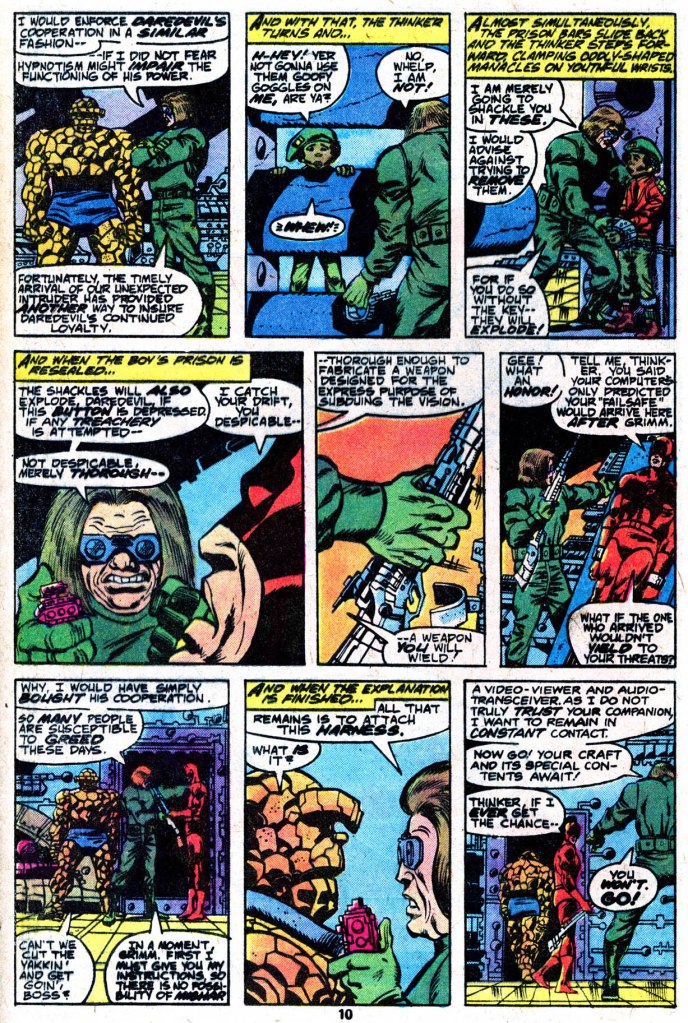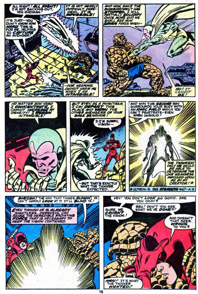 They get back to the Thinker’s base, and the mercurial villain decides that he can’t risk using Daredevil’s predictive abilities any longer–so he tells the Thing to kill DD. Ben gets the sightless adventurer in a bear hug, but then suddenly his victim shrinks out of his grasp. It’s actually Yellowjacket wearing Daredevil’s costume over his own! Daredevil was able to revive him when he went to get the Containment Module, and then DD himself hid inside the module, knowing that the Vision’s glowing, immobilized form would help to conceal him. This ruse is all designed to louse up the Thinker’s predictive calculations by introducing new random elements into the mix and cause him chaos. Remembering that Ben Grimm is the star of the book, Yellowjacket snatches up the Thinker’s hypno-goggles and uses them to deprogram the Thing. And realizing that his logo is on the cover, Daredevil reverses the polarity on the Thinker’s weapon to revive the Vision.