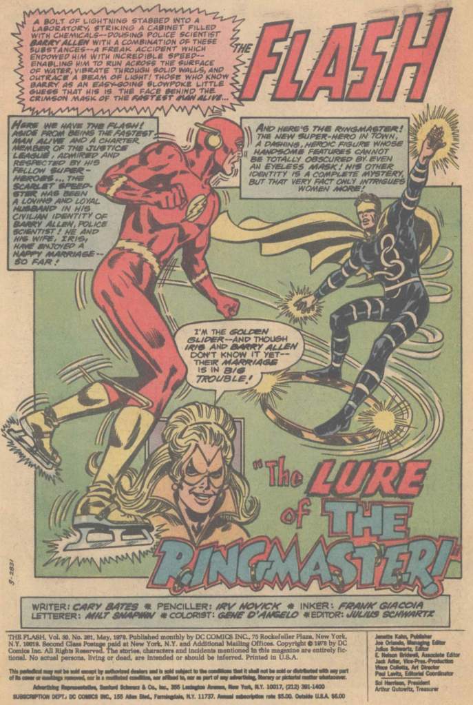 To add insult to injury, albeit after the fact, this issue’s story was the first part of what turned out to be a four-part epic. So I was going to wind up with a cliffhanger left unresolved for months. Writer Cary Bates had begun playing around with having ongoing subplots in the manner of most of the Marvel titles of the time–DC was still very much thinking in terms of story-and-out, regardless of whether that story took a single issue or four. But the Marvel influence was beginning to creep in as DC’s sales continued to flag and Marvel continued to outperform them. Cary had been building the growing threat of the Golden Glider in the background for a few issues now, ever since she learned Barry Allen’s real identity back in issue #257. And now he was ready to bring that storyline to the fore.