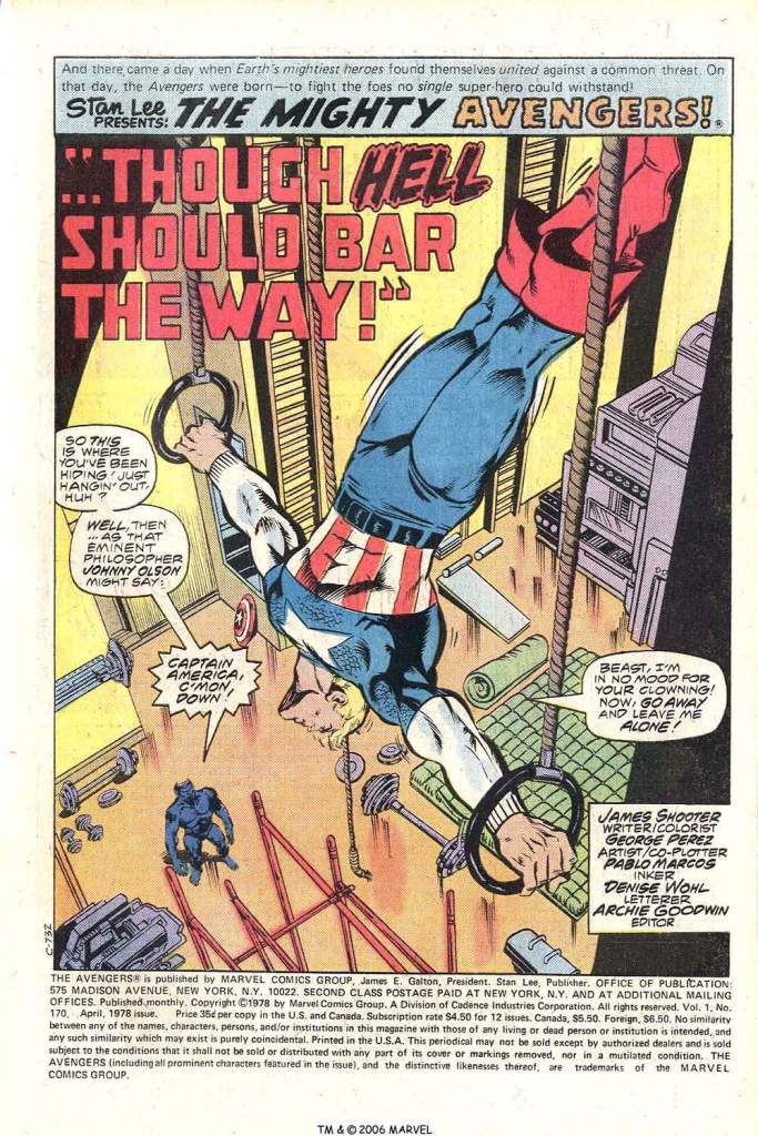 It was a weekend, I remember that much. I had a little bit of cash in my pocket (no idea where I would have gotten it from) and so I made an extra trek down to my regular 7-11 haunt to look at the spinner rack and see if there might be anything worth picking up. And on it, I found copies of two successive issues of AVENGERS, this one and the next one, #171. I had already sampled AVENGERS a month or two before and found it not to my liking, but I had continued to read about the team in MARVEL TRIPLE ACTION. And I liked the artwork of George Perez, who drew both of these issues. So, with no better options available to me, I dropped my seventy cents and took them both home. And that’s where I started reading AVENGERS regularly.