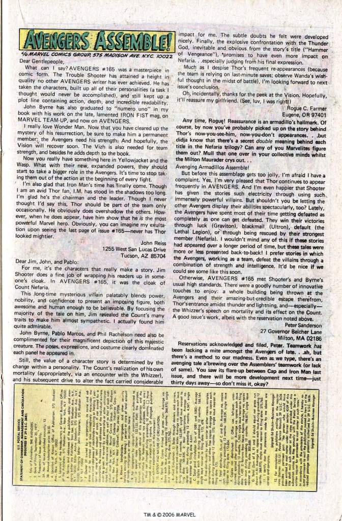 The letters page this time out included another correspondence from Peter Sanderson, who would go on to a career as a comics historian employed by both Marvel and DC, among others. Additionally, the Statement of Ownership for the year ran in this issue, which gives us some insight into how well AVENGERS was performing by 1978. It indicates that the book was selling 173,479 copies on a print run of 375,762, giving the book an Efficiency of 46%. That’s a pretty good number as compared to many of the other titles we’ve been looking at–an indicator that the Shooter and Perez team (along with John Byrne, who had drawn a string of recent issues as well) were moving the needle positively.