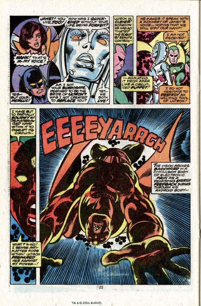 The reactivated Jocasta is confused about her sudden consciousness–even more so given that the Wasp is present, and it was Janet Van Dyne’s brain-engrams that were mean to be the basis for her life and personality. Nonetheless, she instinctively turns the repaired Avengers Mansion’s defenses back on the Avengers as she moves to make her escape from their custody. This turns into a running fight, one in which the Avengers are at least initially restrained by not wanting to knock the hell out of their just-repaired headquarters again. Perez is in fine form here, still jamming his pages with numerous panels but simultaneously keeping the action moving and giving the characters personality. Already, he was about my favorite artist at this time, and his skills were continuing to grow.