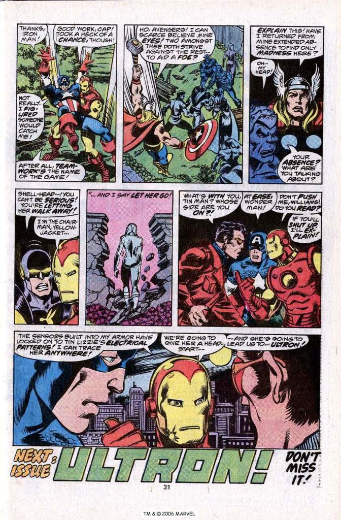 Once again, the Avengers are momentarily at one another’s throats, a recurring motif in Shooter’s run as writer it would seem. But cooler heads prevail with the unexpected arrival of Thor. He’d been showing up in recent issues unexpectedly to serve as a last minute reprieve for the team, so his appearance here is almost par for the course. And when everybody calms down, Iron Man tells him the plan: Jocasta has clearly been reactivated by Ultron, so if they give her a lead, he can track her with his armor, and she will lead them right to their foe. And that’s where this issue was To Be Continued! I moved immediately into the subsequent issue in my reading, but you’re going to have to wait a day for me to write about that one tomorrow.