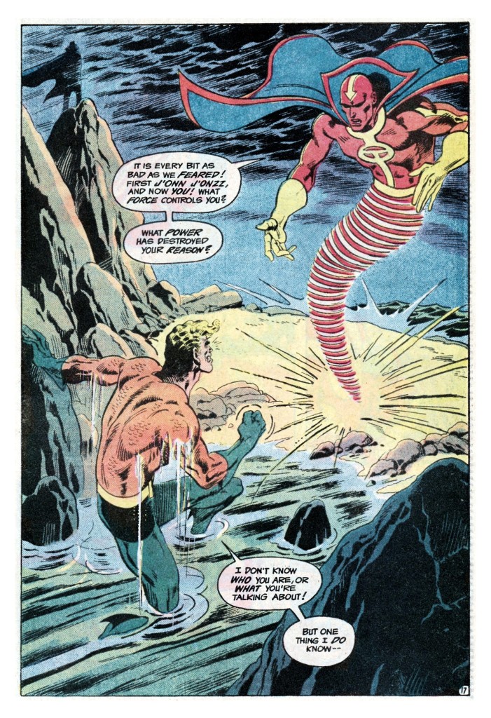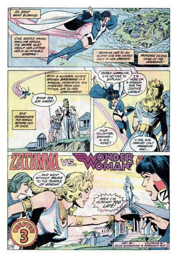 Where the book really excels, though, is in the choices of artist for each of the individual chapters in which an original Leaguer battles a later Leaguer. In virtually every instance, Conway and editor Len Wein are able to secure the services of the perfect illustrator for each match-up. Things start off slowly with Pat Broderick depicting the clash between league newbie Firestorm and the Martian Manhunter–Broderick had no real association with the Manhunter, but he was at the time Firestorm’s regular artist, and he does a great job here. This was during a time when J’onn J’Onzz was only an infrequent guest star in JLA, having relocated with is people to New Mars. Nobody knew how central he’d become to the following decade. This is followed up by Jim Aparo illustrating the clash between Aquaman and the Red Tornado (with third spoiler character the Phantom Stranger also added to the mix). Again teh Tornado didn’t really have a regular artist, but Aparo was well associated with Aquaman from his chem drawing that series, as well as the Phantom Stranger. Dick Giordano was pressed into service for the chapter devoted to Wonder Woman battling Zatanna on Paradise Island, a good selection as Dick drew great women and had worked on both characters.