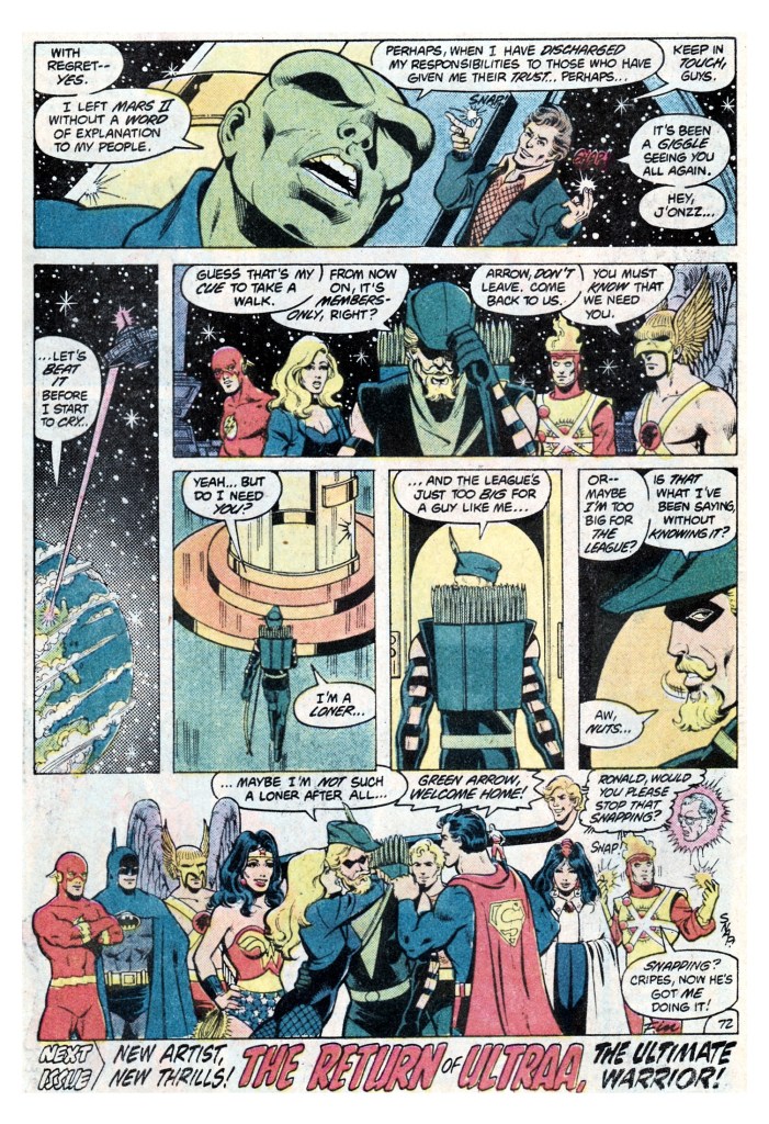 At the end of the story, the assembled League gets to celebrate their victory in their repaired Satellite headquarters. And Green Arrow, who some issues earlier had quit the League due to his feeling that they had become too remote from the sorts of ground-level injustices that he wanted to fight, had a change of heart and rejoined the team. It was the perfect final grace note to go out on. There are a number of really good stories featuring the pre-Crisis Justice League of America. But this book, with a self-contained story that can be enjoyed by a reader even if they’ve never read another issue of the book before, is one of the best.