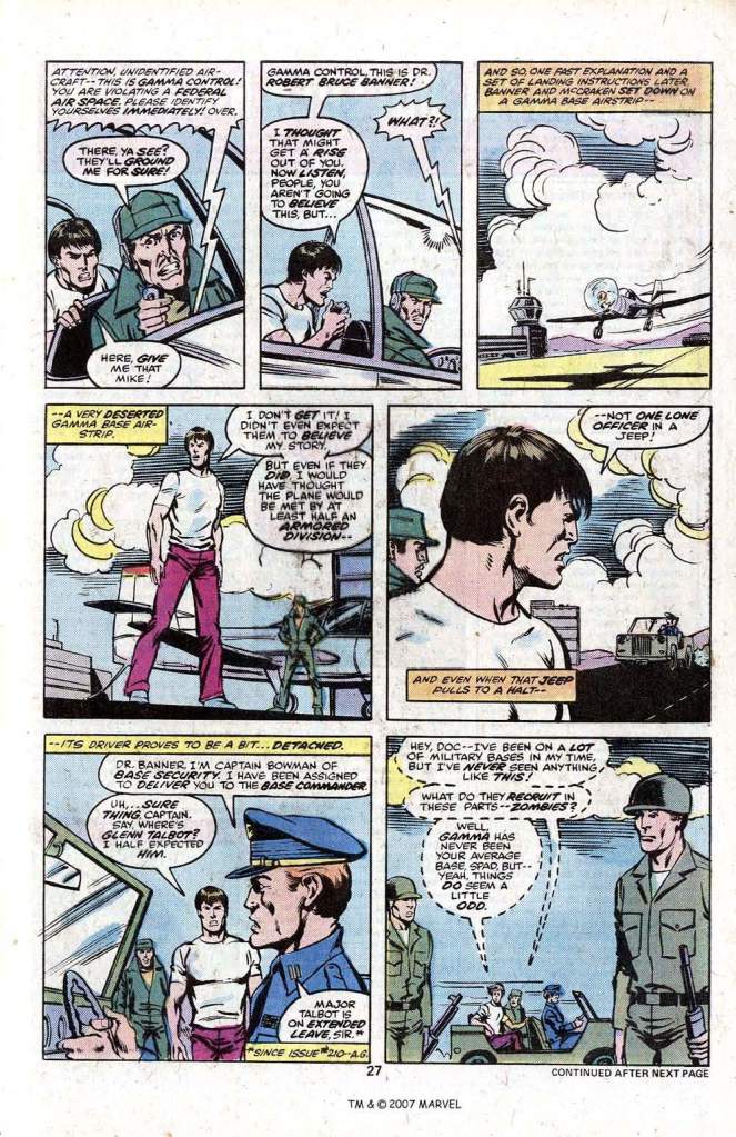 Following this, there’s a two-page interlude with Len Wein’s Hulk supporting cast of teen Jim Wilson, romantic interest April Sommers and magician and con artist Kropotkin the Great that seems like it more or less ties up their stories for the moment (though Jim, at least, will be appearing further.) Then we move into the final portion of the issue, where we find Spad’s plane on approach to Gamma Base. He’s ordered to land and discharge his passenger–and banner is bewildered to find himself met not by an armored division all worried about his emerald alter ego, but rather a single jeep driven by a rather robotic Captain.