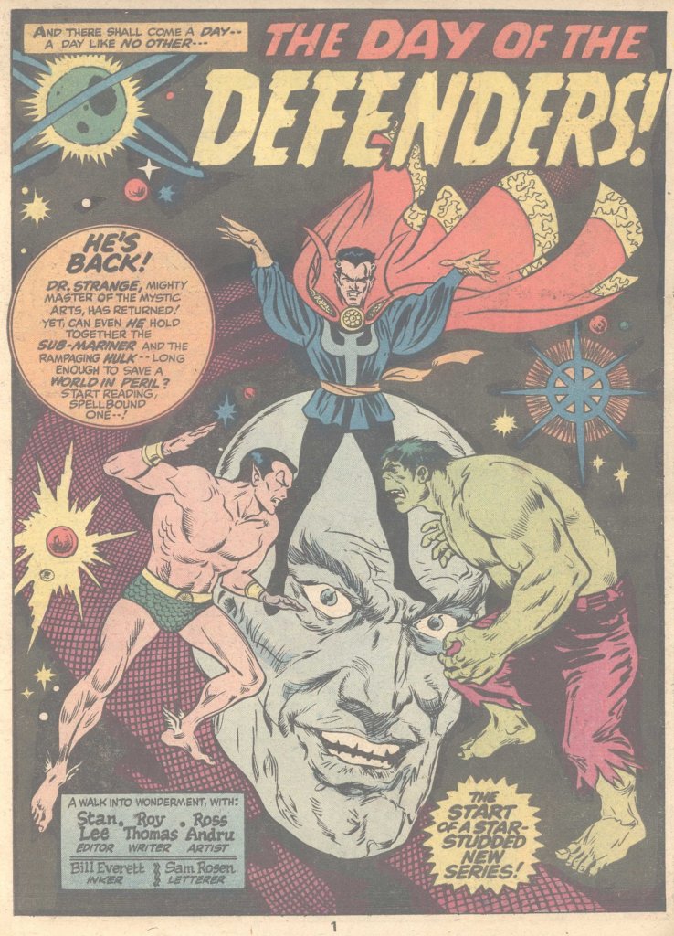 Okay, the Defenders! Writer Roy Thomas had earlier teamed up the Hulk, the Sub-Mariner and the Silver Surfer in a group he called Titans Three (but which he had really wanted to call The Invaders before being shot down by Stan Lee due to the recent television program of that name.) In addition, with the demise of Doctor Strange’s solo series, Roy wound Doc’s last storyline through issues of SUB-MARINER and INCREDIBLE HULK to finish it up. So it was only natural to try to cement the group as a regular team–especially as Marvel was just beginning to expand its output wildly as it entered the 1970s. Proprietary towards the Surfer, Stan Lee forbade him from being a regular part of the combo, so Roy swapped in Strange and the line-up was set. The artwork for this first Defenders story is a bit oddly finished–apparently, inker Bill Everett was angered about the looseness of Ross Andru’s pencils, and in a huff decided to simply ink every line Andru had put down, right or wrong. I’m told there was a huge fight after Everett brought in this job. But with maybe a couple modifications, they still printed it. They had no choice–schedules were tight in those days, and if you didn’t use your press time, you still paid for it.