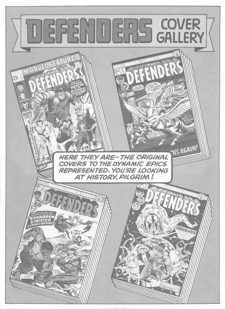 • And then, the Defenders Long Island Hang out page. This was the first exposure I had to a headquarters cutaway and I PORED over this page. (I would later become an avid Handbook collector). The series of heads — some I recognized (Howard the Duck?!), some I didn’t (Son of Satan?) — lining the top made me that much more curious about this team.