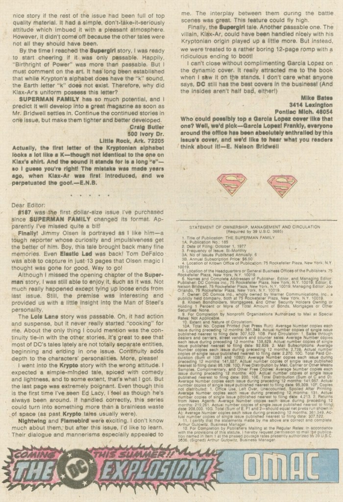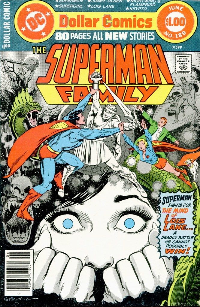 I bought this issue of SUPERMAN FAMILY at my regular 7-11 haunt. Not quite sure why I kept up with the title, to be honest–I had bought two earlier issues because the Superman of Earth-2 was a guest star in one of the stories and I was a sucker for Earth-2. But I had no particular great love for Lois Lane or Jimmy Olsen or Supergirl. Could be that it was simply inertia and habit, a trait I would repeat often in my comic book buying days. It could also be that by this point I had enough money on hand regularly where I could begin to spread out my buying a little bit more. I’m not entirely certain when I started my Pennysaver paper route, delivering circulars twice a week and assembling them on the preceding two evenings. But from that point on, I was constantly liquid enough to buy not only any new comics that I wanted, but a steady stream of back issues as well. Also, that’s a great cover by Jose Luis Garcia Lopez. I’m not certain who colored it, but the decision to leave Lois’s face stark white with those bullseye-like blue eyes was a master stroke. It’s a bit encumbered by cover copy and stuff, but it’s still plenty effective. If I remember correctly, my brother later bought himself a copy of this same issue as well.