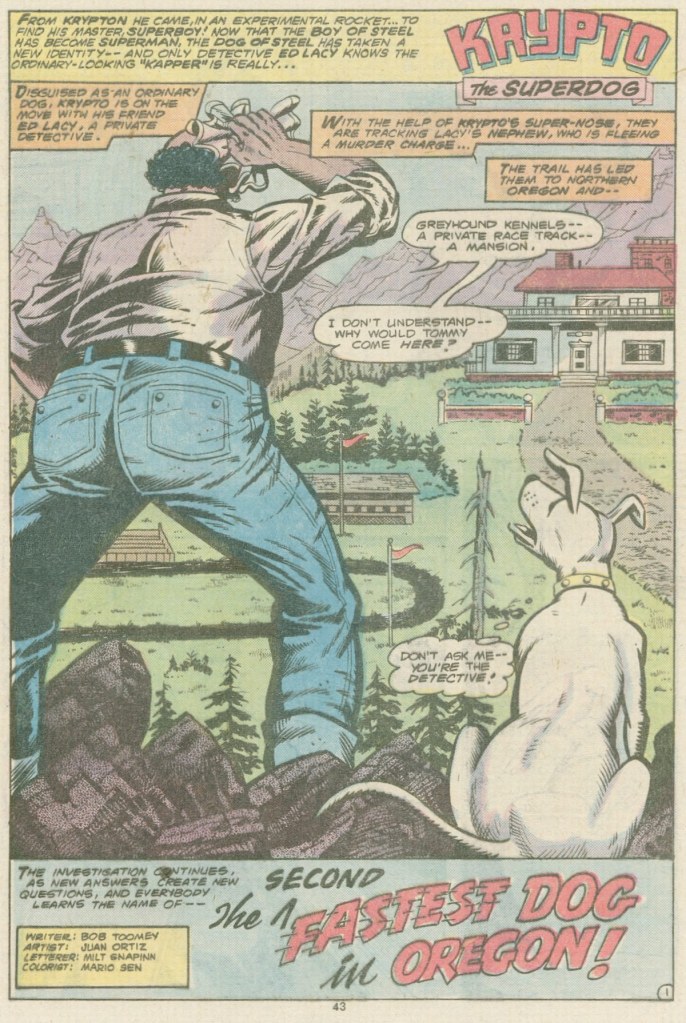 The next story breaks Schaffenberger’s streak on this issue, as Juan Ortiz steps up to the plate. It’s another Krypto solo story, as the dog of steel continues to help his human friend Detective Ed Lacy search for his missing nephew. It’s a nice enough entry, and really feels like the model for a 1970s weekly television series, though because of that there isn’t a whole lot of dram a in it, for all that it’s well told. And Krypto gets to throw a race to an egotistical racedog because he needs to protect his secret identity for some reason. At the end, Krypto disappears–into, we are told, the following issue’s full length spectacular. But I wouldn’t read that for another month.