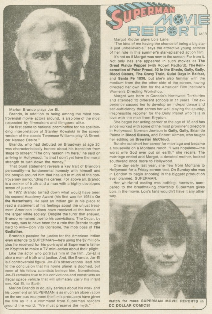 There was also an update on the then-filming Superman movie, which at that time didn’t quite seem like a real thing to me. At 11 years of age, I didn’t know who Marlon Brando was or why I should care that he was playing Jor-El, and the grainy, gloopy photographs of both he and Margot Kidder did nothing to interest me in the project