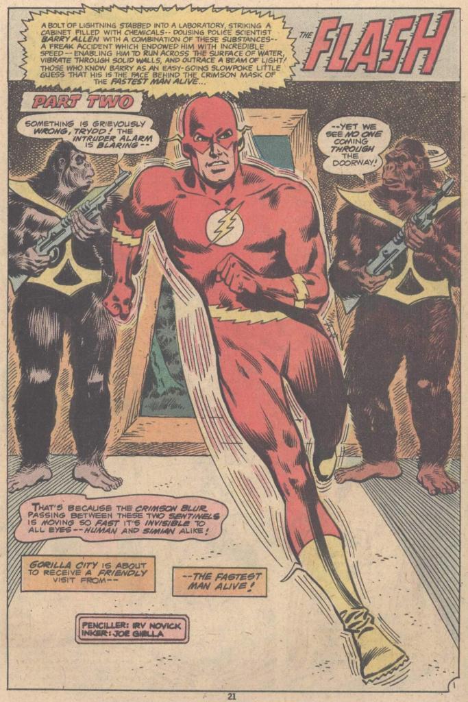 This was a monster book, all-new, an adventure that brought together all of the Flash characters then extant: The Flash himself, Kid Flash, and Earth-2’s Golden Age Flash. Also appearing was Johnny Quick–an appearance that would cause some continuity agita once Roy Thomas began using him in ALL-STAR SQUADRON years later. That front cover by Jose Luis Garcia-Lopez is great, one of the best FLASH covers from this era. Garcia-Lopez really could draw anybody from the DC stable well, and it’s no wonder that the look of DC’s mainstream licensing efforts reflected his style for so many decades. The book opens with a short prologue set in far-off Gorilla City, where the evil Super-Gorilla Grodd is being executed for his many crimes. The satanic simian is completely discorporated in on live television before the eyes of Gorillakind.