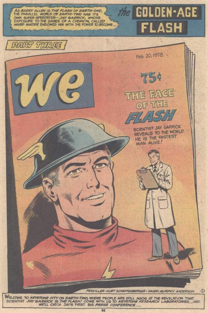 Chapter Three of this extravaganza focuses on Jay Garrick, the original Flash who lived on the parallel world of Earth-2. We learn here that he has revealed his true identity to the world, since he’s largely in retirement. Artwork is provided by Kurt Schaffenberger and Murphy Anderson–Anderson’s inks give Schaffenberger’s pencils a nice sense of heft, bringing them closer in line with the accepted DC look of the period than they ordinarily might have been. As mentioned earlier, this story also marks the first new appearance of Johnny Quick since his solo strip ended in the early 1950s. He and his partner Tubby Watts have come to cover Jay Garrick’s press conference for their news service. But the covert simian uses his ray-weapon to cause an additional X-element to be added to Johnny’s speed formula when he speaks it, causing him to become malevolent. He and Jay clash a few times, and ultimately Jay also crashes through an unforeseen speed barrier as he tries to snap Johnny back to his senses–which he does.