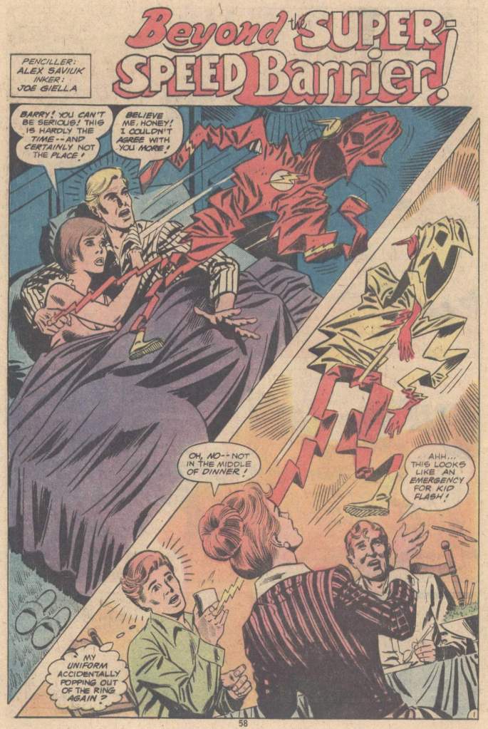 The big continuity event that takes place in this story is Wally West’s graduation from High School. He also, ultimately, reveals his identity as Kid Flash to his parents–these are very different incarnations of his parents than the ones who would turn up post-CRISIS, this is Bob and Mary. There isn’t a whole lot to them, apart from filling the roles of generic mother and father. Along the way, Kid Flash has an extended delusion that the girl he’s hanging out with becomes a super-speed motorcycle rider before burning up from the friction. This all proves to be a dream–the cause of which appears to be a hidden simian with a powerful raygun device. But Kid Flash is nonetheless compelled to break through an unsuspected speed barrier by traveling at a particular vibrational frequency in his chase for the phantom girl. Garcia-Lopez handles the artwork in this chapter as well, inked by the legendary Wally Wood, who isn’t as overpowering here as he sometimes could be. So it’s a strong set of visuals.