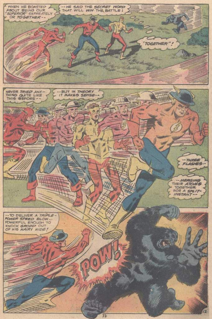 What’s more, having merged his essence with the three Flashes, Grodd has also commandeered a portion of their speed. When combined with his Mind-Force powers, this makes him more than a match for his trio of foes. An extended battle takes place, with Grodd knocking the hell out of the triad of Flashes. Ultimately, Barry decides to try a trick that honestly should not work at all, despite the fact that his thoughts tell us that it “makes sense”. By vibrating into intangibility, he’s able to merge his bodily molecules with those of both Jay and Wally, becoming a triple-Flash for just a moment–long enough to kayo the speed-enhanced simian.